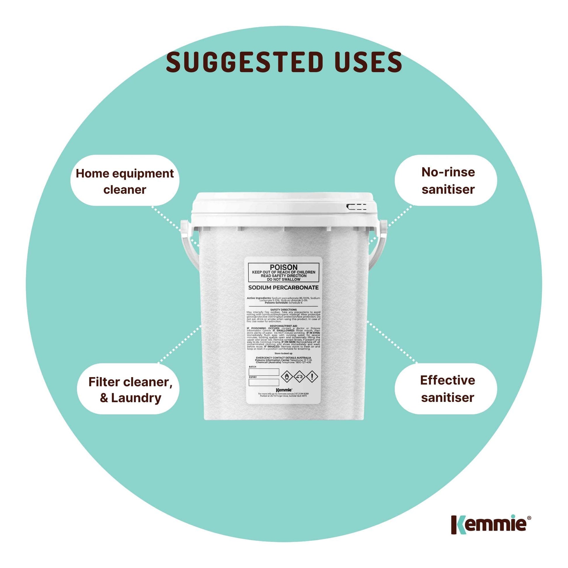 Sodium Percarbonate is a multi-purpose powder used in deck, carpet, household and laundry cleaning products. Also, used as a home brewing equipment cleaner and a mild no-rinse sanitiser.
