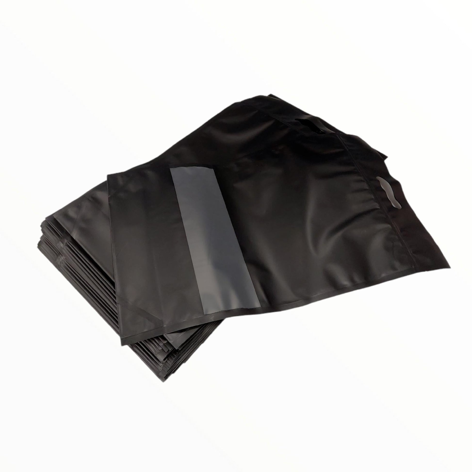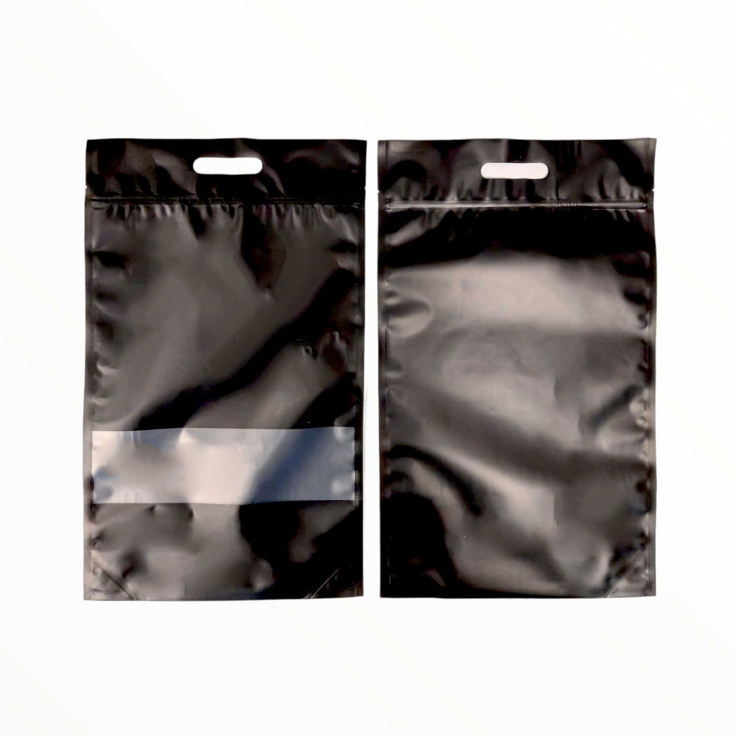 Perfect for retail food storage and non-perishable items, these standup packaging bags are matte black, with a clear window and feature 3 layers of protective material for longer food shelf life.