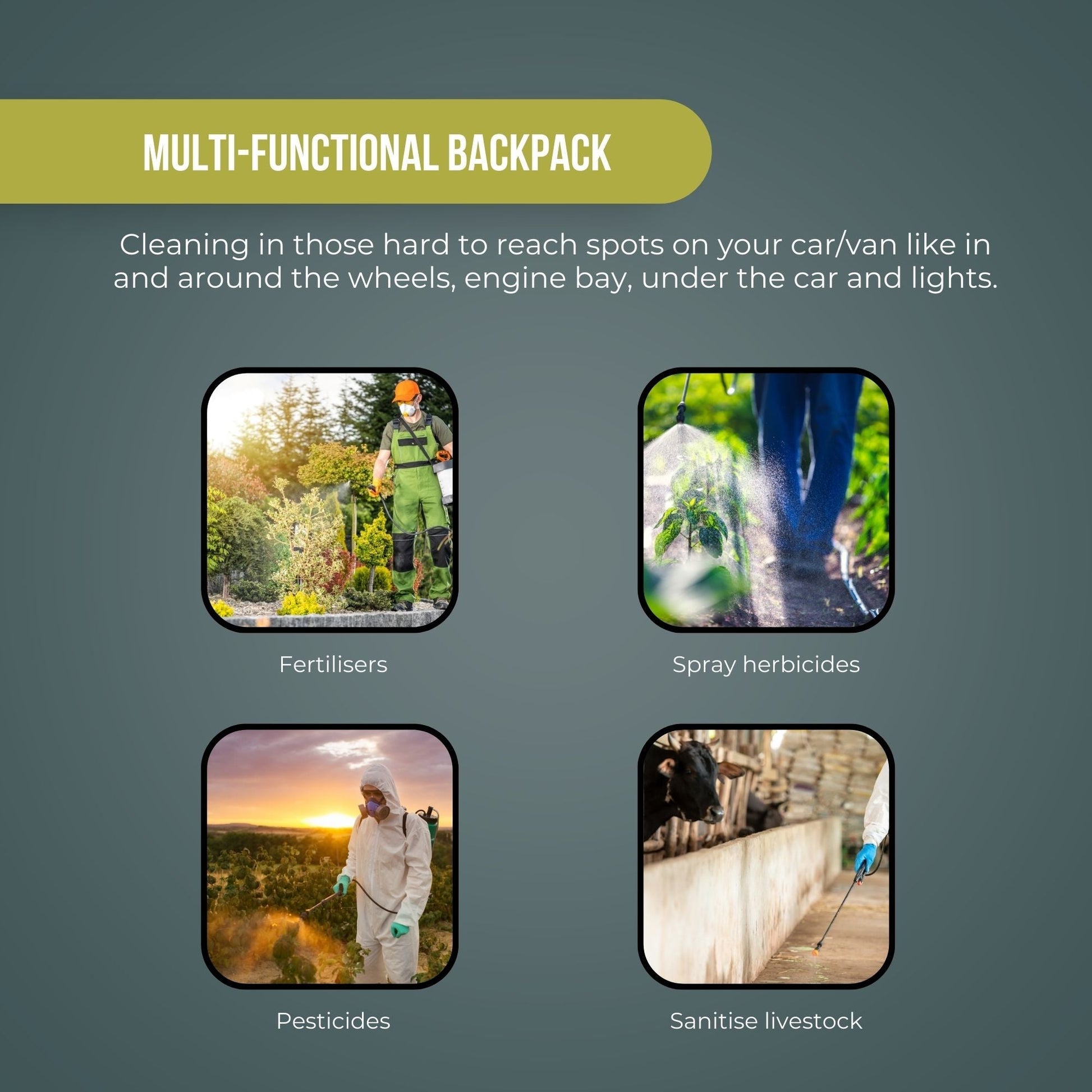Can be used to spray water, cleaning detergents, fertilisers, herbicides, pesticides