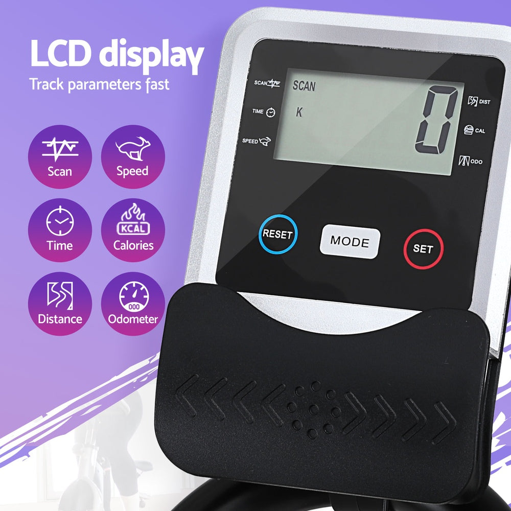 Designed for comfort and practicality, the extra-thick padded seat and adjustable handlebars ensure an ergonomic fit. The LCD display tracks key metrics like time, speed, distance, and calories burned, while the built-in phone holder keeps your device accessible. With secure pedals, transport wheels, and partial assembly, this spin bike is perfect for those seeking convenience and quality.