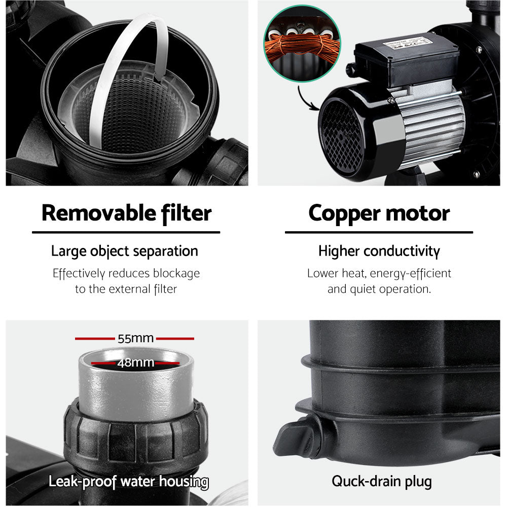 The water pump is able to handle salt water or chlorine filtered pools. Its built with a corrosion resistant marine grade cast iron motor housing and chemical resistant thermoplastic filter and cartridge tank body which allows the pump to be tough and durable. It provides efficient and effective cleanin with its in built filtration basket designed to capture and prevent fine debris from entering the pump.