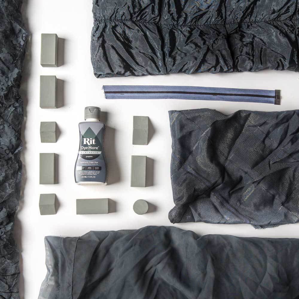 A dye made specifically for synthetic fabrics, which includes anything with 35% or more polyester, acrylic or acetate. Each little bottle packs a colourful punch and is ready to deliver a custom touch to garments new and old, household items, and more. It even works on 3D printed items, lacrosse sticks, wigs and most plastics. Plus, just like our original formula, Rit DyeMore is non-toxic and safe for sewer and septic systems.