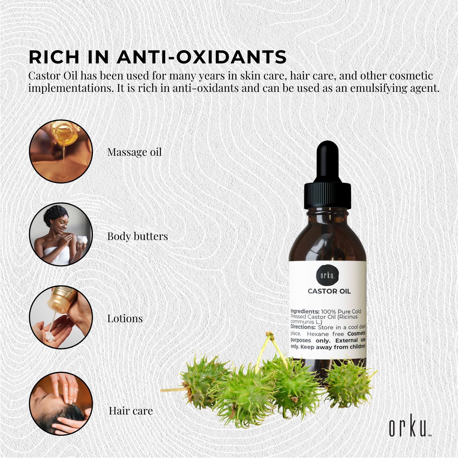 Castor oil, which can also be known as a carrier or massage oil, has been used for many years in skin care, hair care, and other cosmetic implementations. It is rich in anti-oxidants and can be used as an emulsifying agent.