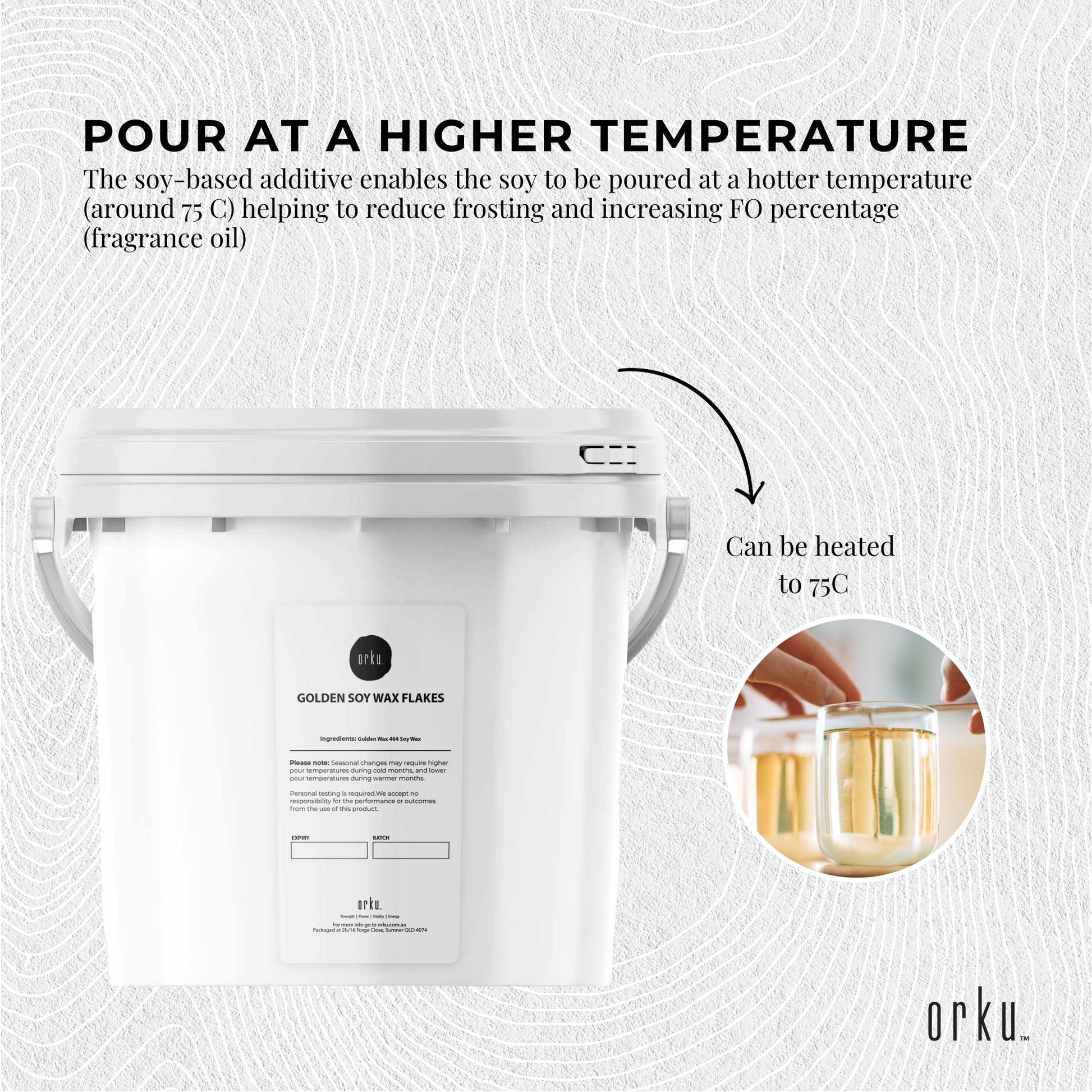 Easy to use professional grade Golden Wax 464 Soy wax is a hydrogenated soy oil and contains a soy-based additive.ÊIt is 100% pure Soy wax and is a natural alternative vegetable wax and kosher. The soy-based additive enables the soy to be poured at a hotter temperature (around 75 C) helping to reduce frosting and increasing FO percentage (fragrance oil)