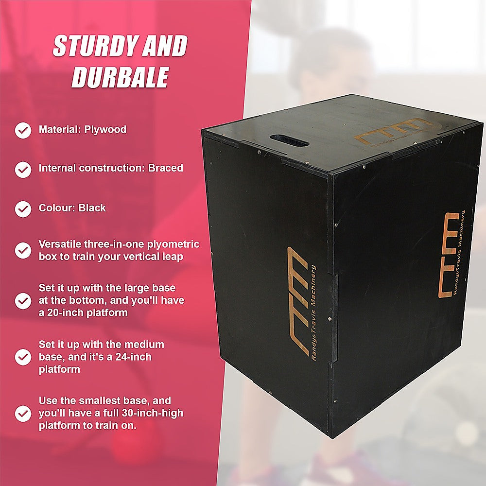 Gain more height and explosiveness using Randy Travis Machinery's versatile three-in-one plyometric box to train your vertical leap. Turn the box three ways to start small and work your way up to a full 30 inches. Set it up with the large base at the bottom, and you'll have a 20-inch platform. Set it up with the medium base, and it's a 24-inch platform. Use the smallest base, and you'll have a full 30-inch-high platform to train on.