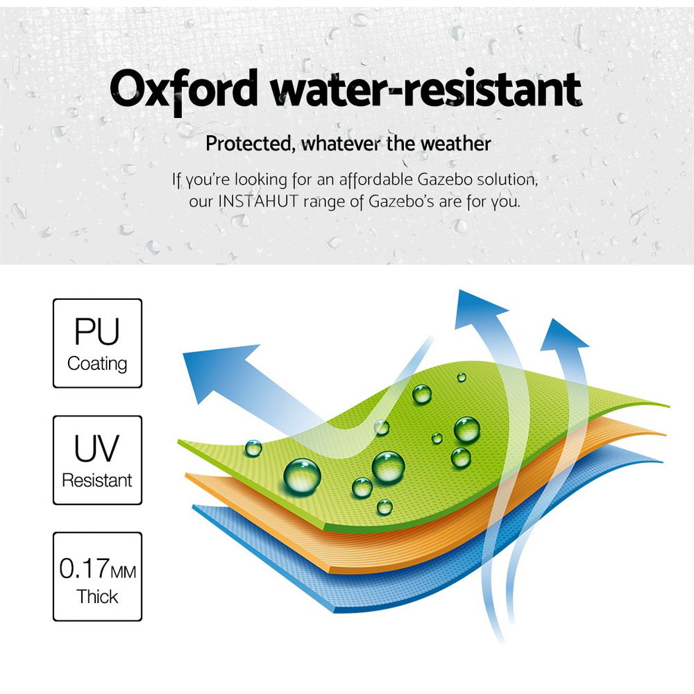 With a wide roof coverage of 300cm by 600cm, the exceptional 6kg cover is made of durable PU coating Oxford fabric thats both UV and water resistant. No more worries about being too hot or too wet, you can get your event going with total peace of mind from the elements. Giving you ample dry cover from rain and adequate protection from UV radiation.