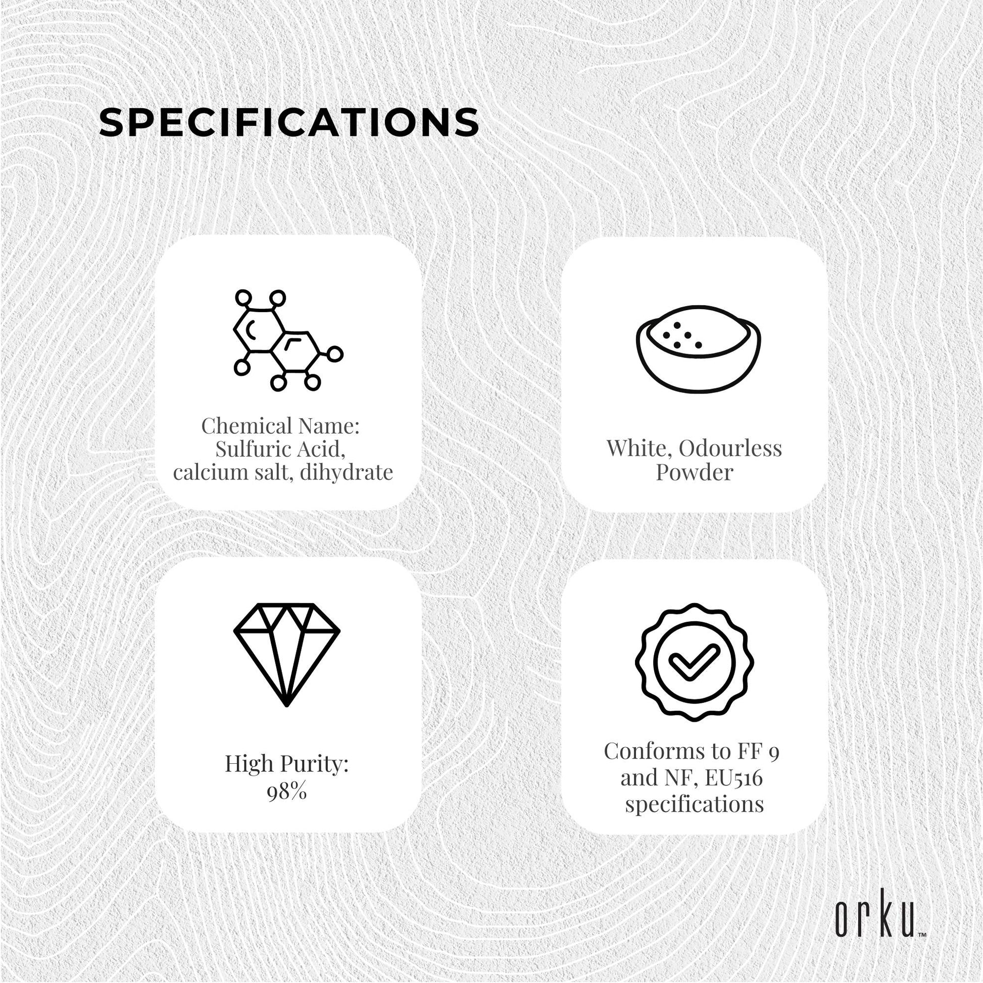 Our Calcium Sulphate is produced by grinding a select grade of high quality white gypsum, and is food grade, conforming to FFC9, NF, EU516 standards.