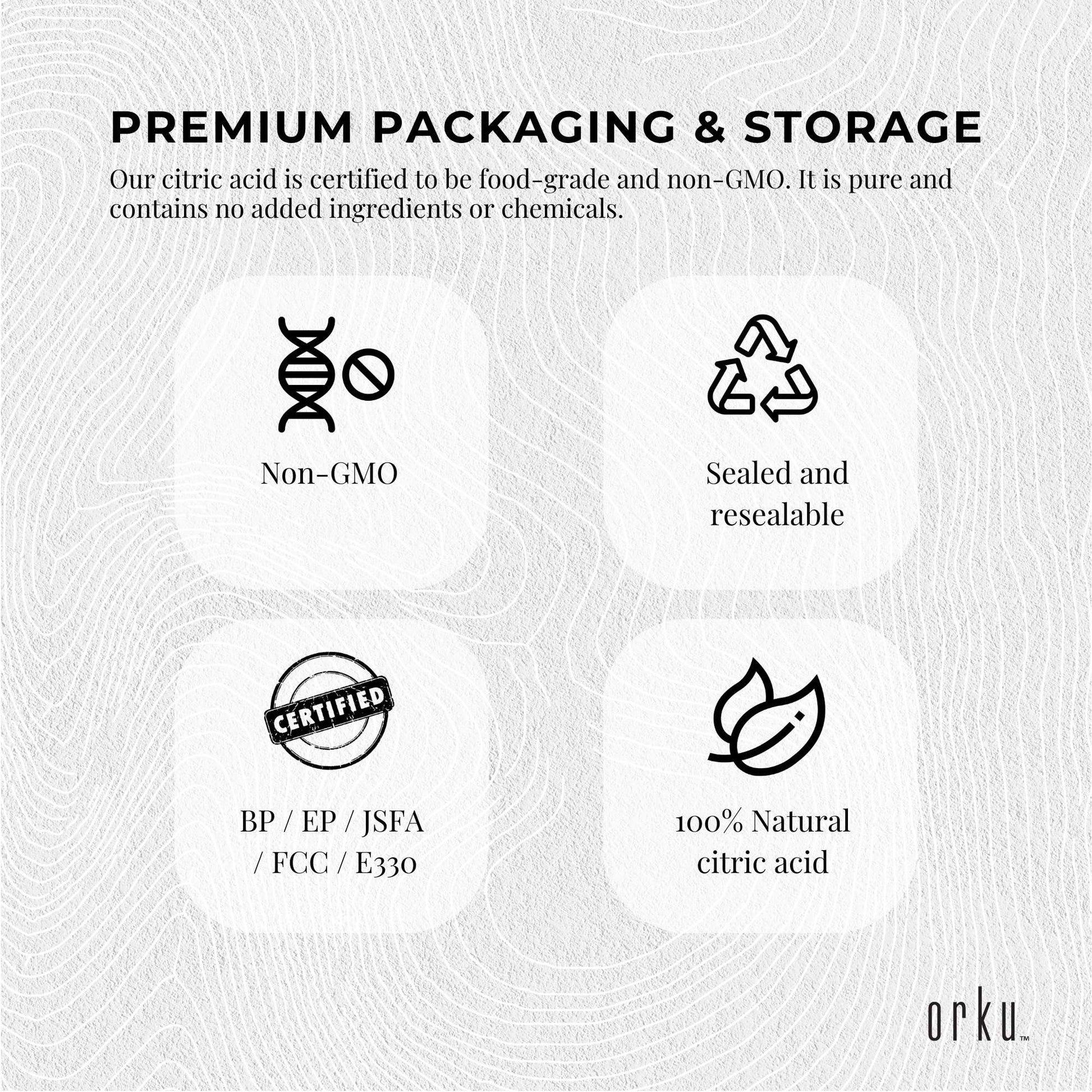 Our Citric Acid is fully compliant Food Grade GMO Free Certified BP / EP / JSFA / FCC / E330. Packages come in quality sealed and resealable bags.