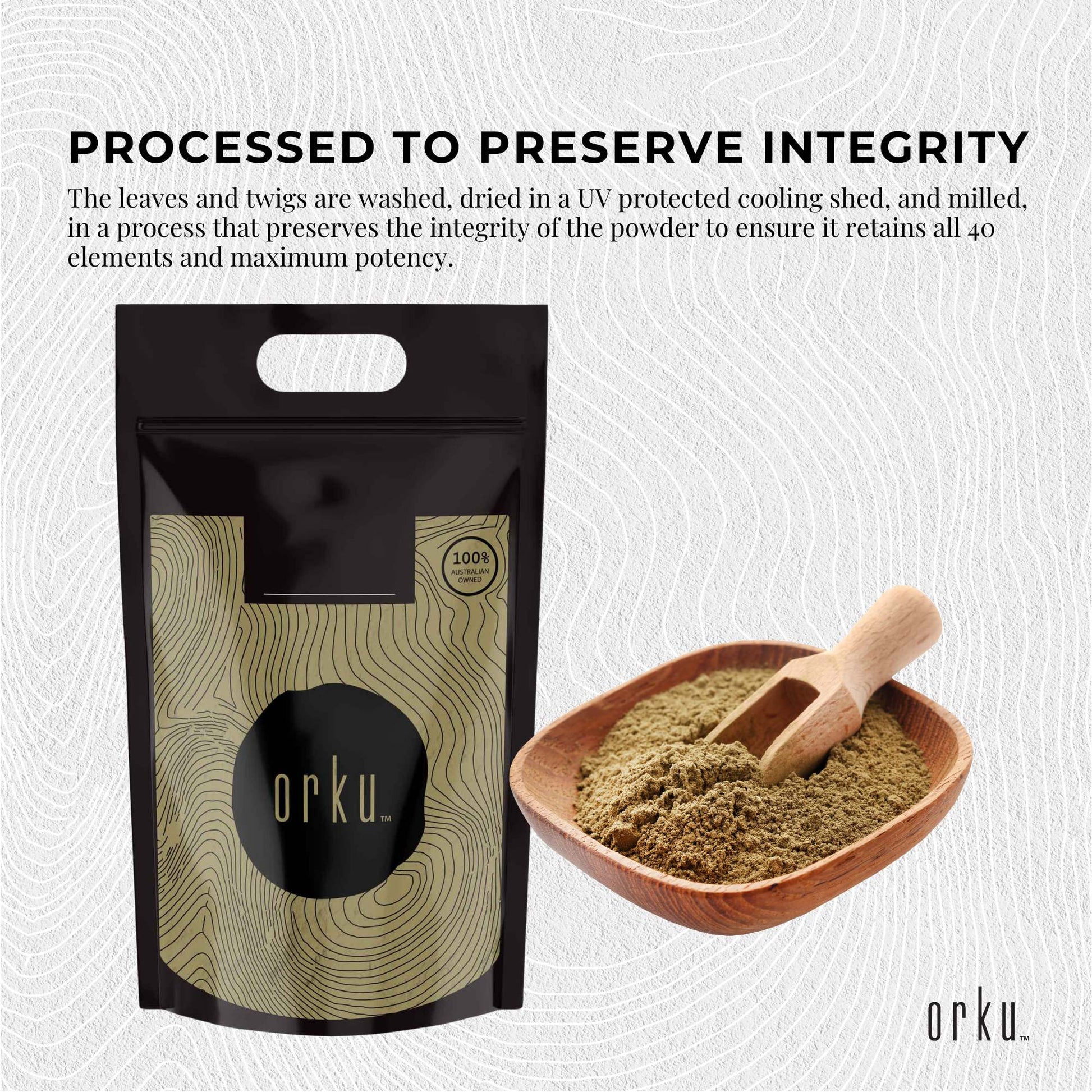 The leaves and twigs are washed, dried in a UV protected cooling shed, and milled, in a process that preserves the integrity of the powder to ensure it retains all 40 elements and maximum potency.
