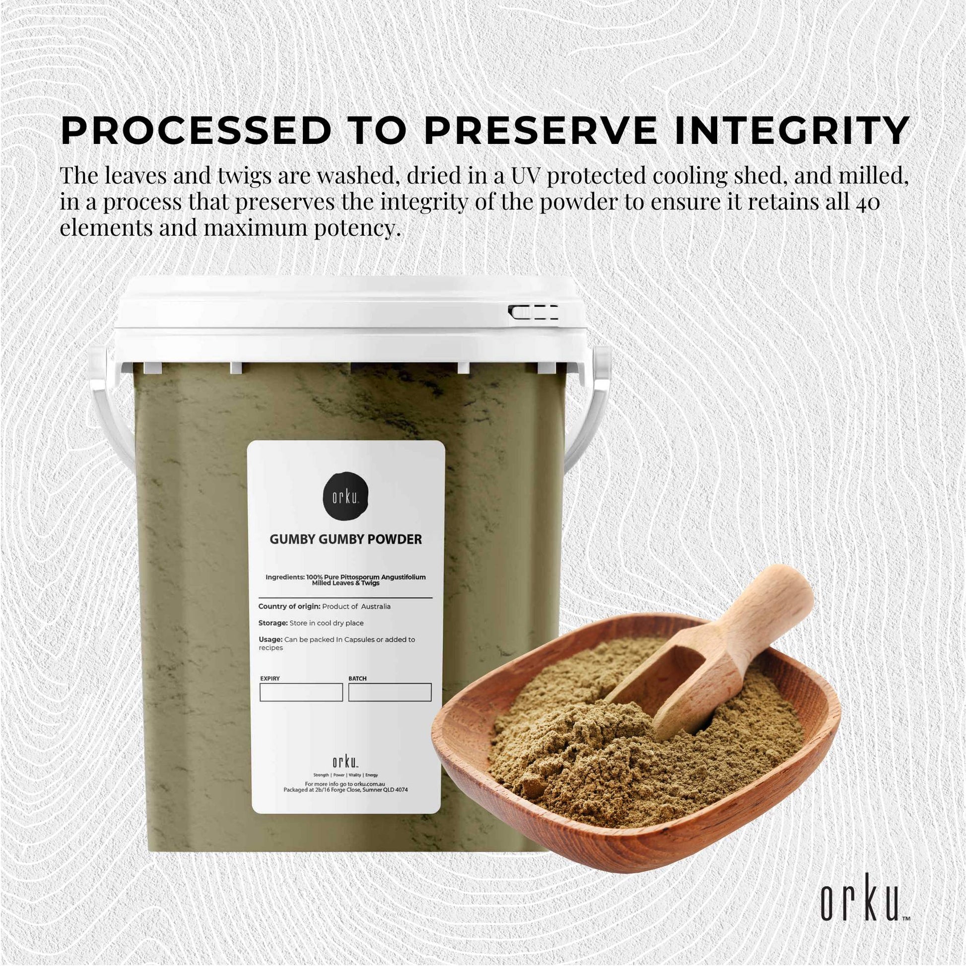 Orku Gumby Gumby?(aka GumbyGumby)?powder?is made from hand selected leaves and green twigs of only the youngest shoots?of healthy Gumby Gumby trees.