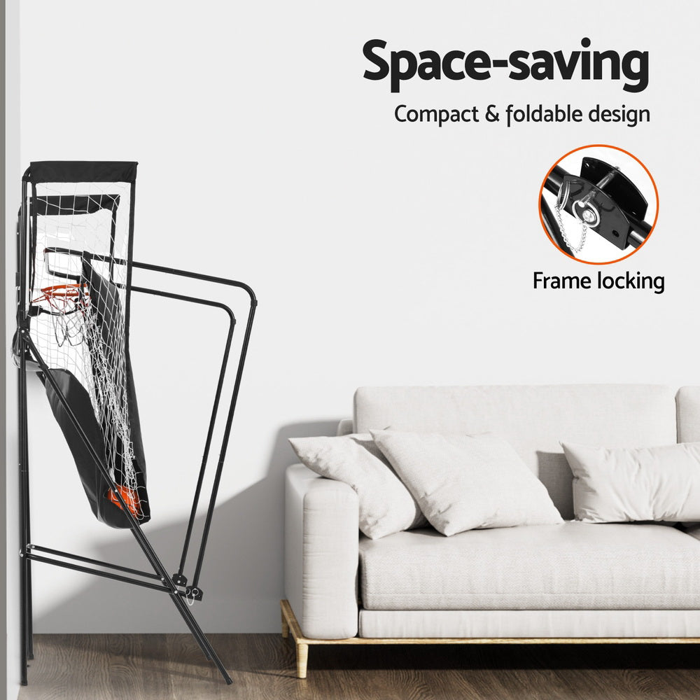 Bring the thrill of the arcade home with your very own Basketball Shooting Machine. The game is made from quality coated steel tubes that are rust-resistant as well as a waterproof and stain-resistant printed polyester fabric that is sturdy and durable, so you can use it indoors or outdoors. Realistic sound effects make you feel like youre at your local arcade hotspot. The LED automatic score counter provides an accurate and impartial referee for two players, no fighting on the courts! The high net catches stray balls and returns them quickly and easily so you can get back to fun. The triangle frame design, secure lock and anti-slip feet always keep the game stable. With a foldable, portable and easy-to-assemble Velcro design, you can play basketball in minutes, whether at home or on the road. Includes two additional basketballs so you can keep shooting for the stars, no interruptions! Game on to victory with your very own arcade-style Basketball Shooting Machine.