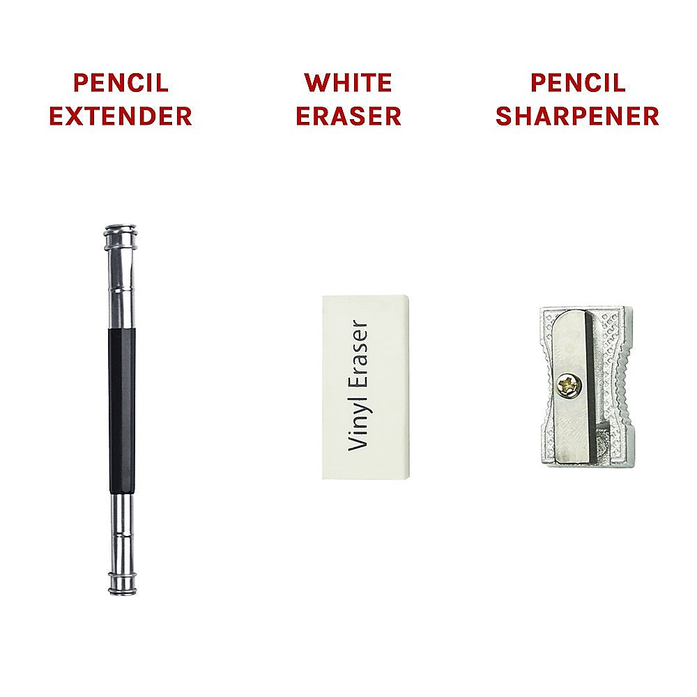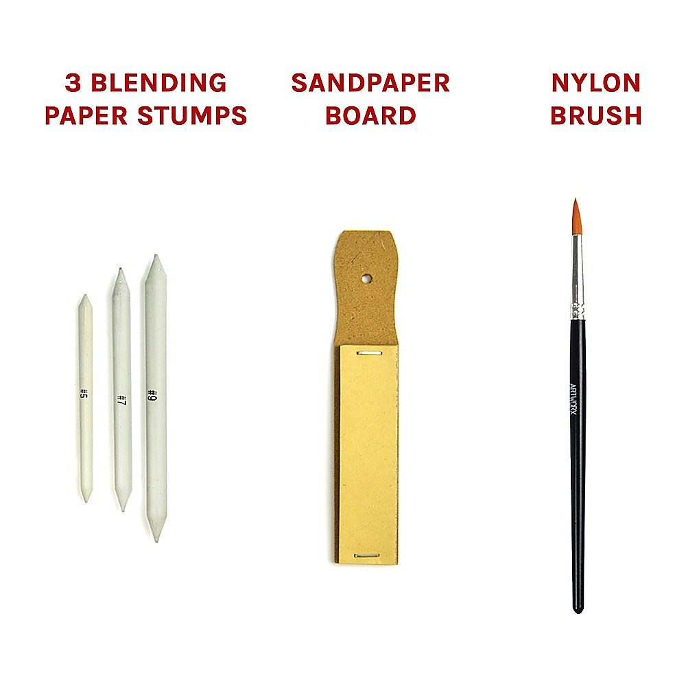 - 12 sketch pencils, including 8B, 6B, 5B, 4B, 3B, 2B, B, HB, 2H, 3H, 4H, and 5H