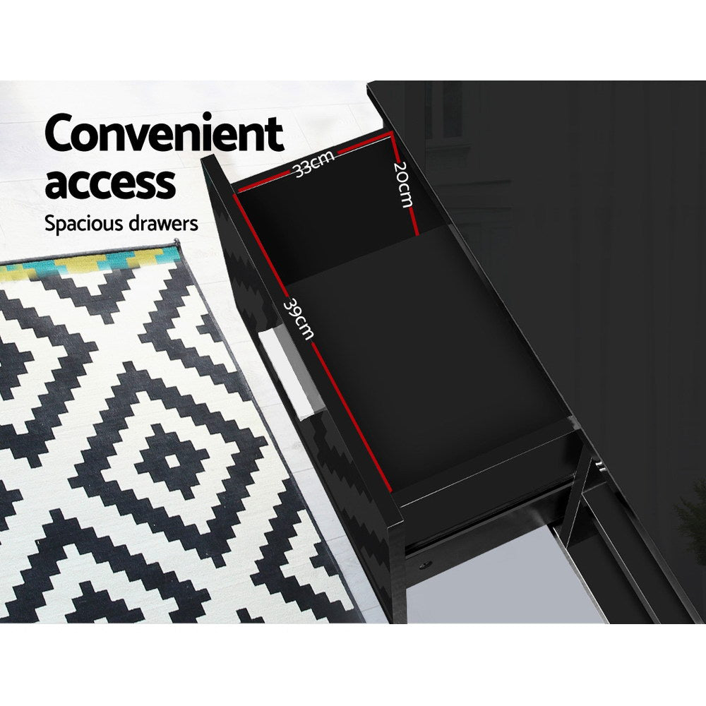 Need a stylish and modern entertainment unit for your home? Look no further than our Artiss Entertainment Unit which is absolutely stunning in every aspect. Made of particle board, the entertainment unit is sturdy and durable with equally fine hardware to ensure trouble-free use every time. The UV high gloss finish is flawless and smooth to the touch. The unit will be the perfect addition for your modern living room with its contemporary and linear design. And it offers ample storage space with two open shelves, and two drawers for all your entertainment essentials. Plus, the drawers feature aluminium handles that add a stylish accent to its black hues. Not least, the pre-drilled holes at the back allow for neat and tidy management of all cabling connections.