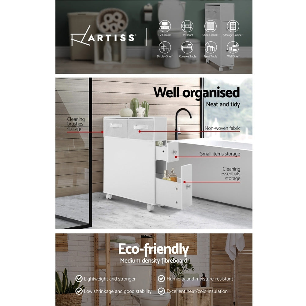 Update your bathroom to turn a chaotic routine into a calm one. With the Artiss Toilet Storage Caddy, you can store your daily bathroom items and access them easily knowing where they are. It creates space and order too, making your bathroom neat and tidy. The slim and compact caddy comprises an non-woven basket, storage drawers and cleaning brush holders too. Made of quality and eco-friendly MDF board, the caddy is more stable and stands up better in heat and humidity. It is also fitted with castor wheels for easy movement.