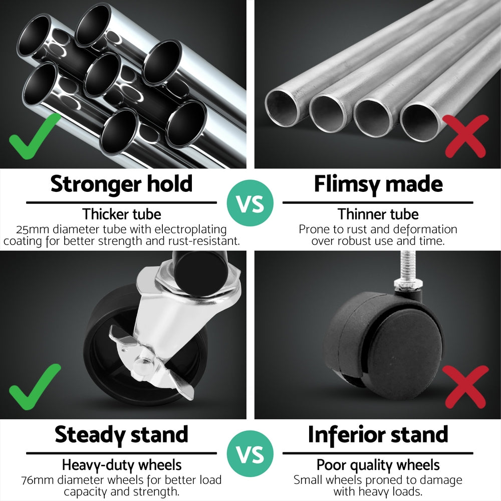 Organise outfits effortlessly with Artiss heavy-duty clothes rack, combining industrial strength with smart design. The corrosion-resistant metal frame ensures long-lasting support for coats, dresses, or other items. Glide smoothly across floors with 360° swivel casters – two lockable wheels keep the rack stationary when needed. Adjust the horizontal rod length to accommodate different clothing sizes, while protective plastic caps shield walls from scratches. Collapse the rack vertically for under-bed or cupboard storage. Perfect for rental spaces, retail displays, or daily home use!