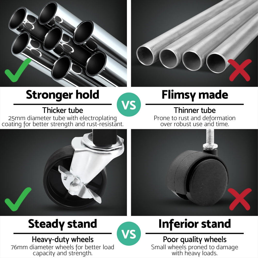 Organise outfits effortlessly with Artiss heavy-duty clothes rack, combining industrial strength with smart design. The corrosion-resistant metal frame ensures long-lasting support for coats, dresses, or other items. Glide smoothly across floors with 360鎺 swivel casters 閳 two lockable wheels keep the rack stationary when needed. Adjust the horizontal rod length to accommodate different clothing sizes, while protective plastic caps shield walls from scratches. Collapse the rack vertically for under-bed or cupboard storage. Perfect for rental spaces, retail displays, or daily home use!