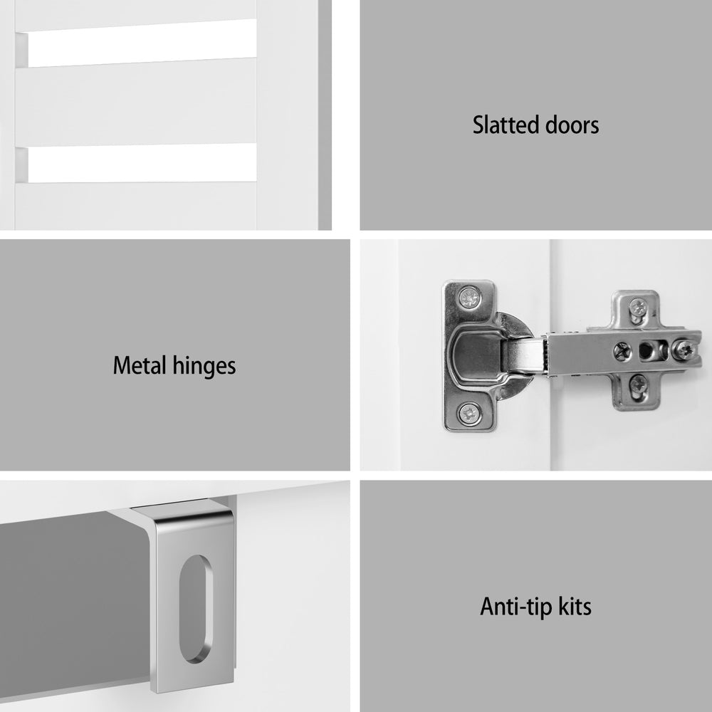 Compact 5-tier shoe cabinet with ventilated slatted doors (114 x 33 x 97 cm) provides practical storage for hallways or laundry spaces. Crafted from engineered wood with a hard-wearing melamine surface, this Artiss organiser features 3 adjustable shelves, push-to-open access, and wall-mount hardware. Strengthened metal hinges support daily use, while slatted airflow design helps reduce enclosed odours. Cabinet-style storage maintains tidy spaces without protruding hardware.
