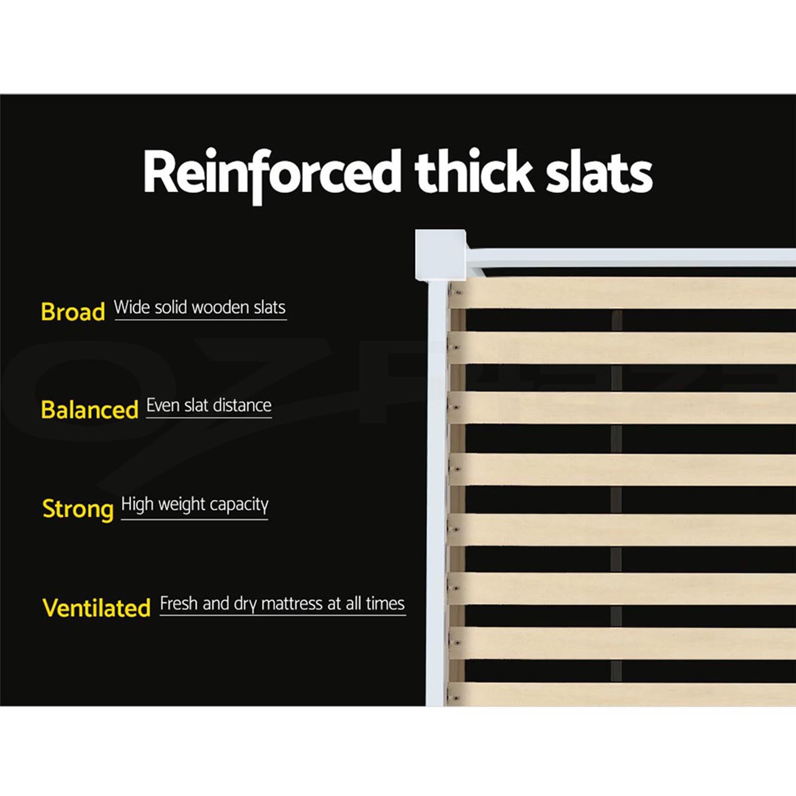 Made of natural pine wood, the Rio bed frame is ideal for your kids as it for any adult. Strong and sturdy, the bed frame comes with a solid timber slated base, stylish headboard, heavy duty steel fixings and smooth edges all round. Finished in a non-toxic, eco-friendly white paint, the neutral coloured bed frame makes for easy decoration coordination with any bedroom. The bed frame becomes an instant storage area with acres of space for your bedding essentials. Go extra neat and tidy. So create more and expand your home storage capacity with the Artiss Rio Bed Frame. Get yours today.