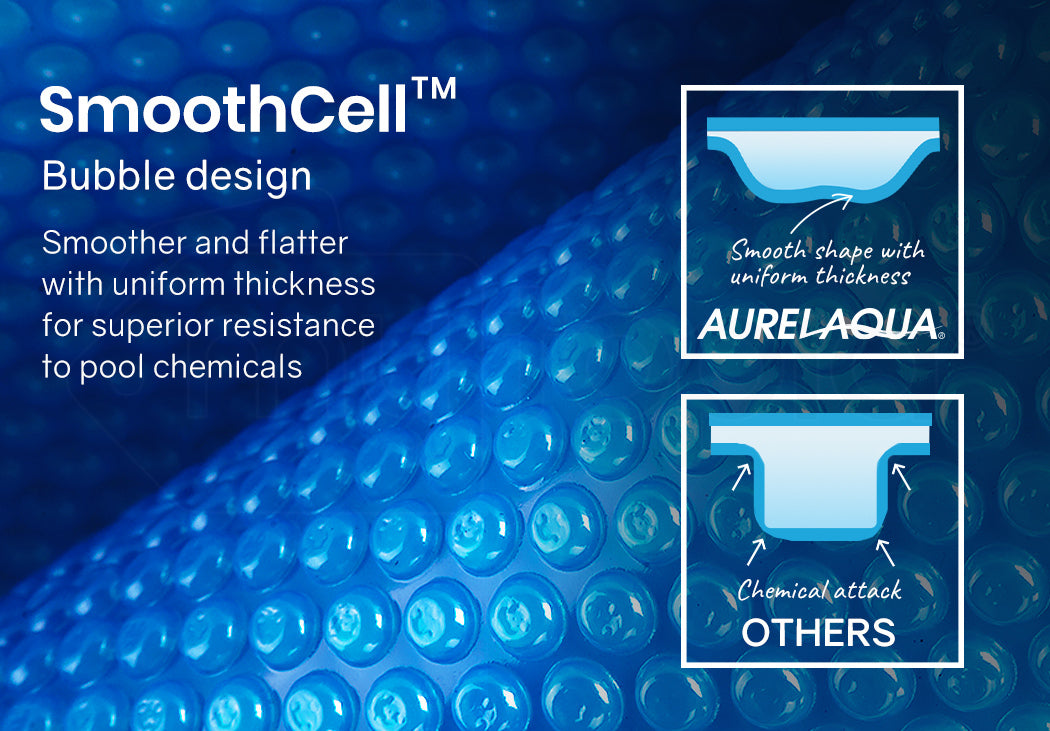 The exclusive Aurelaqua Solar Swimming Pool Cover features an exclusive bubble design with a smooth and flat shape without any sharp curves that are prone to being thin weak points. These thinner sections in other pool blankets are more susceptible to damage by pool chemicals and general wear and tear.