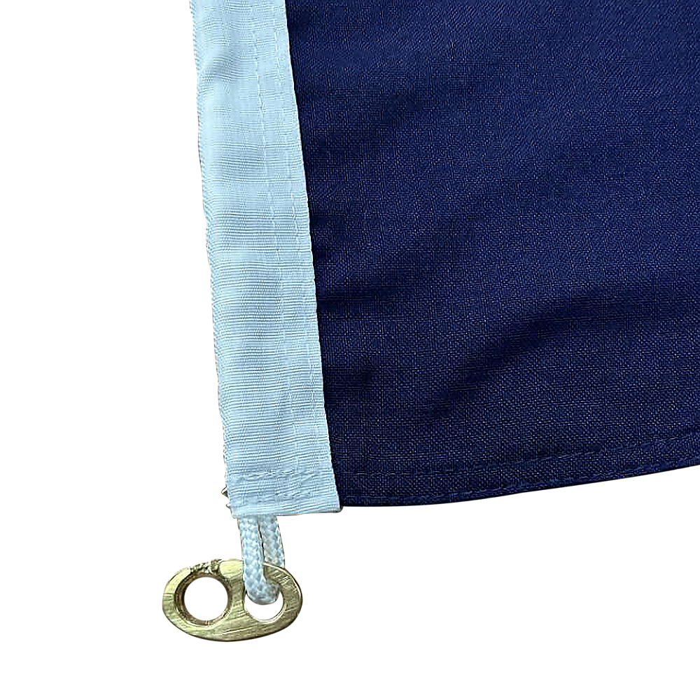 Designed with 100% bleed-through capability, the flag exhibits consistent coloration on both sides. It features four lines of reinforced stitching along the edges and is equipped with two brass sister clips attached to the rope. It's important to note that the clips on the flag are closed; hence, if you intend to mount the flag on a pole, please ensure that the clips on your pole are open.
