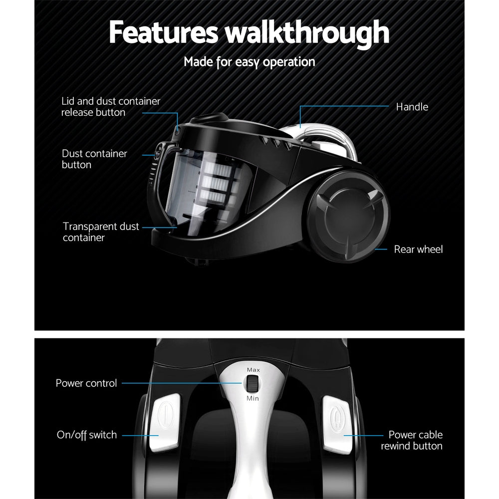 The convenience of bagless vacuuming with the power of effortless cleaning. Such is the Devanti Bagless Vacuum Cleaner that makes light work of even the toughest cleaning tasks. With its 2200W suction power, the vacuum cleaner utilizes a multi-cyclonic system that separates large debris from fine dust. The dust is filtered through a HEPA filter that eliminates up to 99.97% of allergens. Clearing the dust is an easy matter of pressing the release button to remove the lid and dust container and pouring the contents away. The HEPA filter is also washable and reusable. The vacuum cleaner comes with a retractable cord for easy mobility, a 360閹 rotatable hose and a telescopic stainless steel handle that can be fitted with different heads included in the accessories pack.