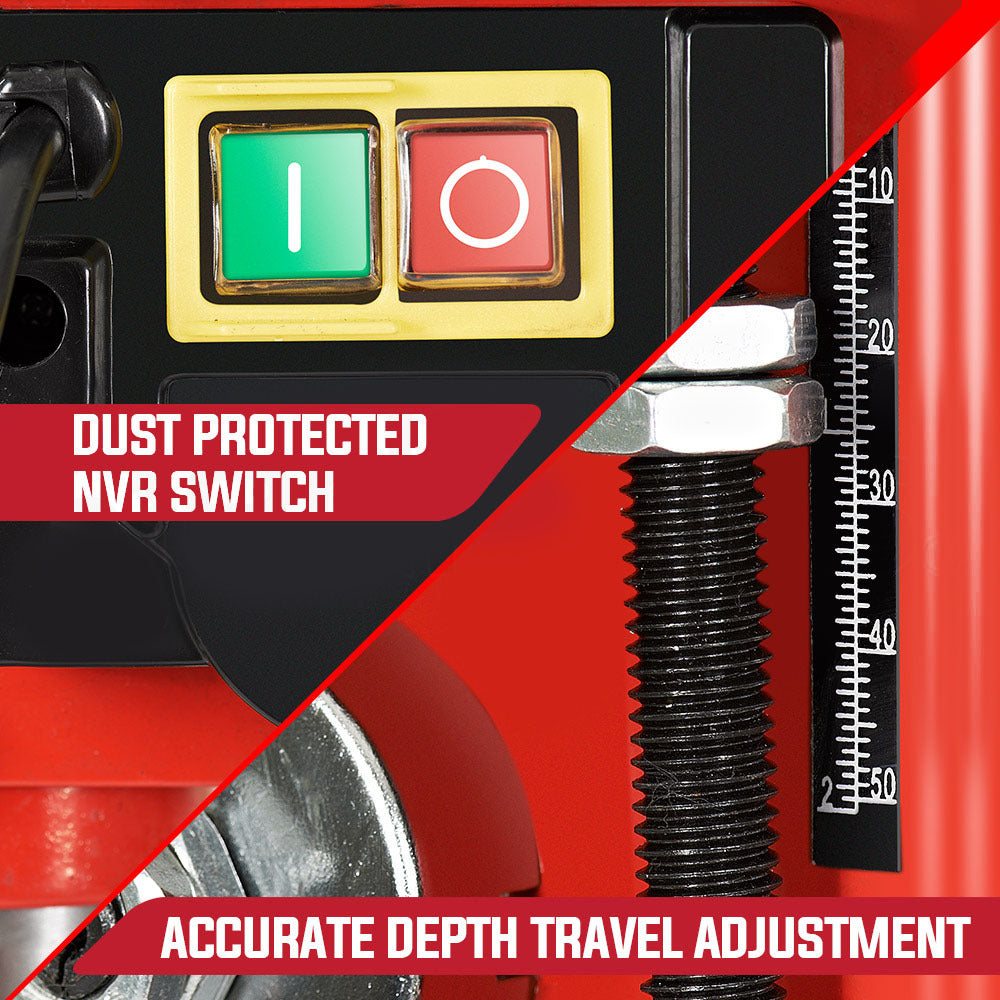 The DP13 Series II has been designed with smooth, powerful and consistent drilling in front of mind. Its 50mm depth adjustable drill travel is accompanied by a sturdy height adjustable work table, accommodating the various types of objects to be drilled and the precision required. Moreover, the work table is also angle adjustable to 45 in either direction. The three spoke handle works in harmony with the rack and pinion spindle feed to produce a clean and fluid press. The removable chuck guard offers user protection and is also designed to be set out of the way for exposed drilling. For further protection, the DP13 Series II also comes fitted with dust protected NVR switches, so no restart will occur once power is restored in the event of an outage.