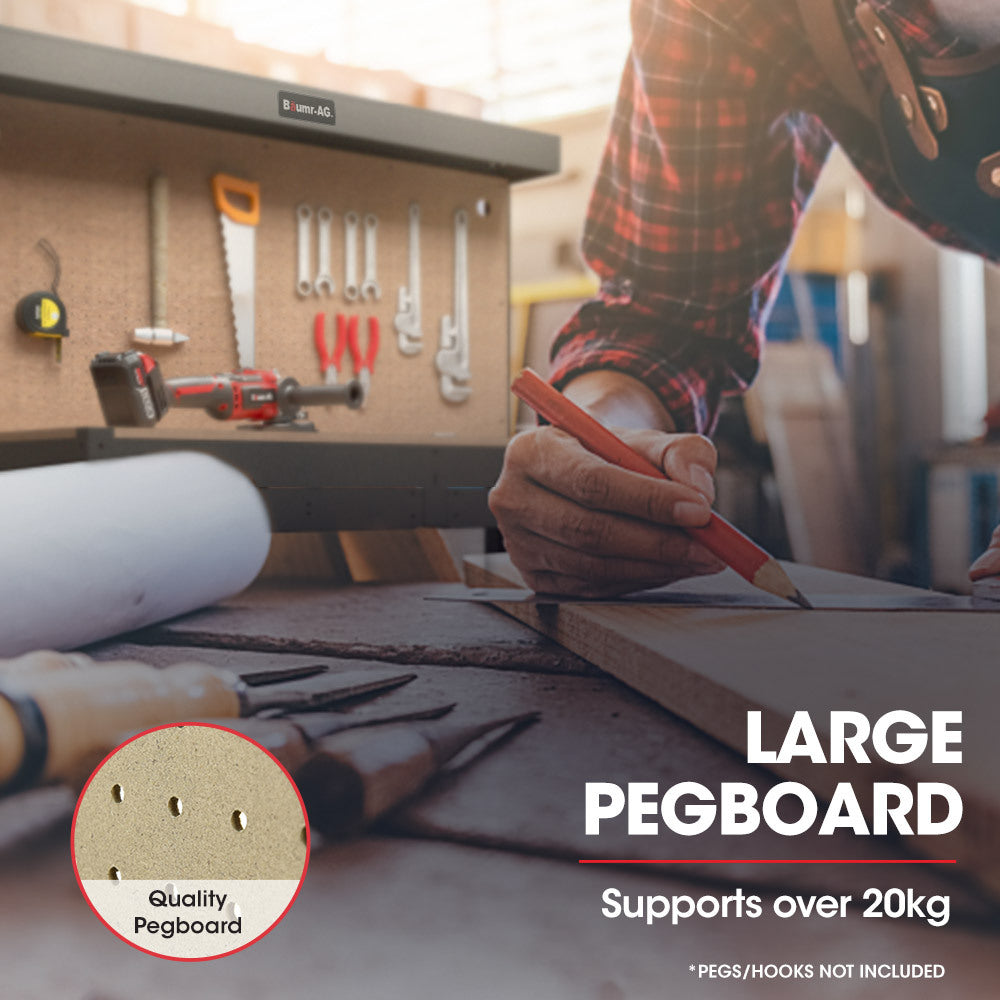 The Baumr-AG multi-purpose work bench has an integrated LED worklight for optimal visibility in any room. It also comes complete with a four socket 10 amp power board that you can attach wherever you like on the pegboard. Charging and powering your tools and accessories now couldn閳ユ獩 be easier閳ユ攷aking the Baumr-AG work bench a great all-arounder for any home garage or workshop.