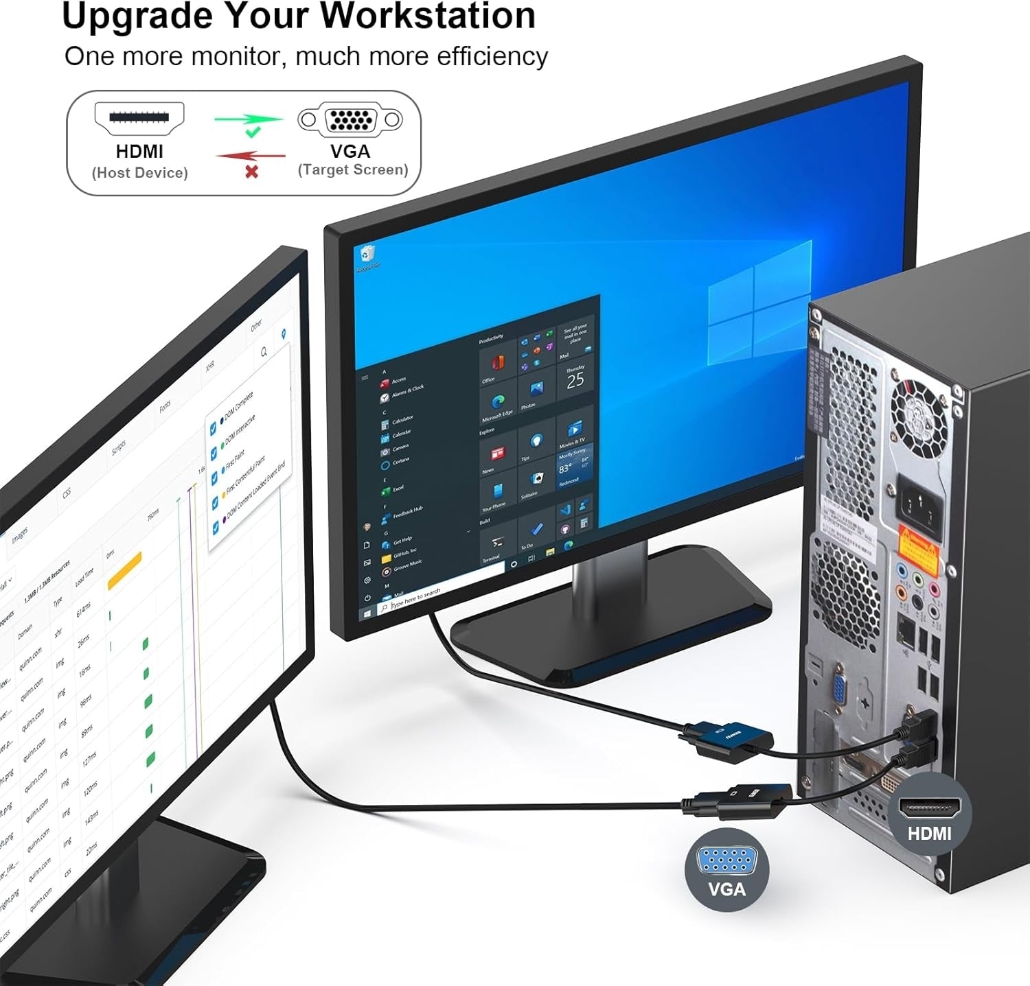 The compact-designed portable Benfei HDMI to VGA adapter connects a computer, desktop, laptop, or other devices with HDMI port to a monitor, projector, HDTV, or other devices with VGA port; Tuck this lightweight gadget into your bag or pocket to do a business presentation with your laptop and projector, or extend your desktop screen to a monitor or TV; A VGA cable is required.