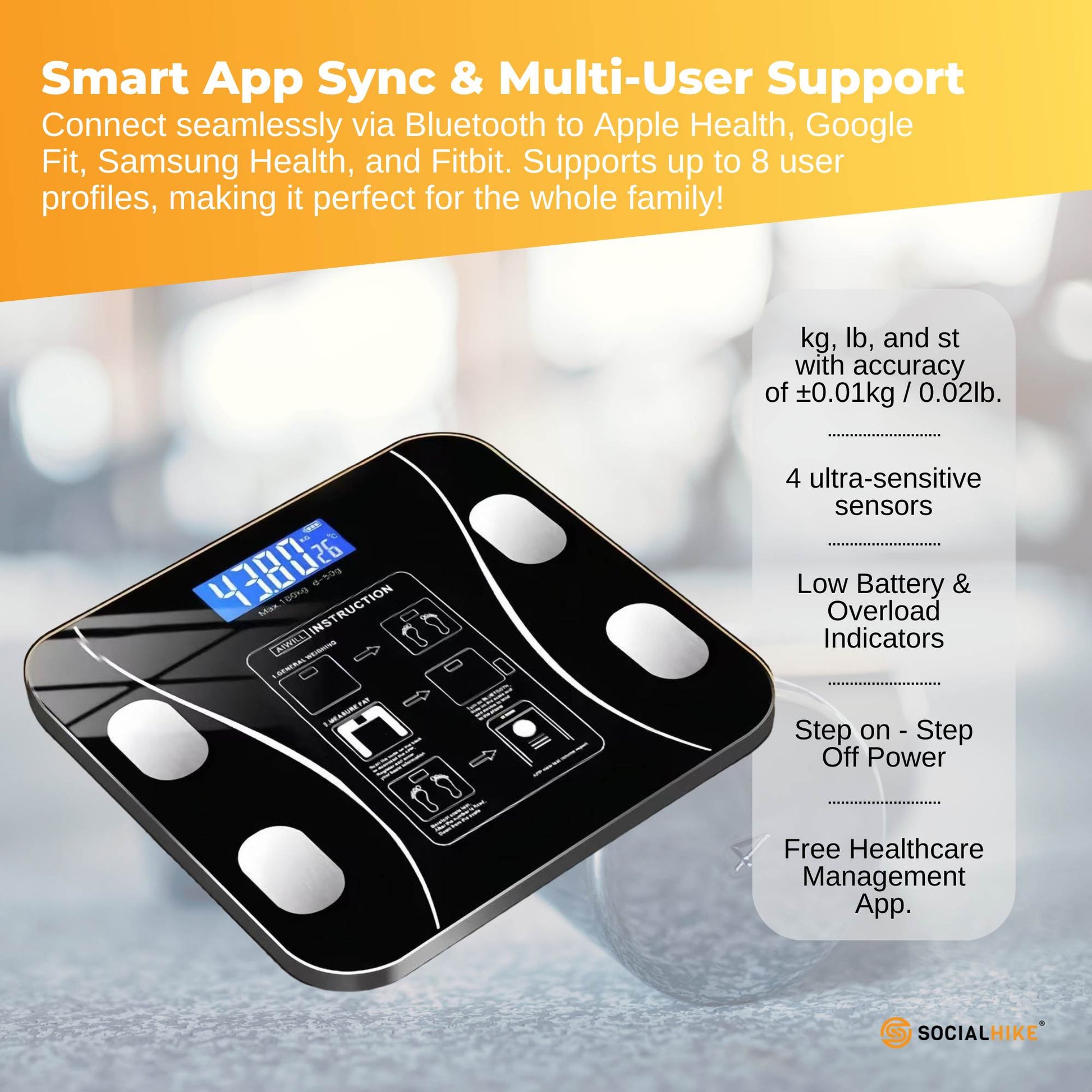 Smart App Sync Multi-User Support – Connects via Bluetooth to Apple Health, Google Fit, Samsung Health Fitbit, with support for up to 8 users, making it perfect for the whole family.