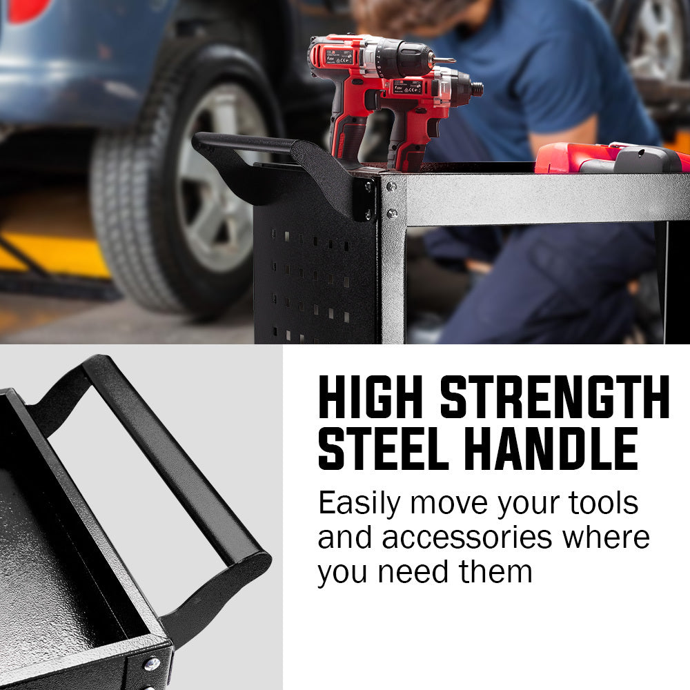 Bullet 3-Tier Steel Tool Trolley Cart, for Workshop, Mechanic, with Pegboard, Screwdriver Bay, Black