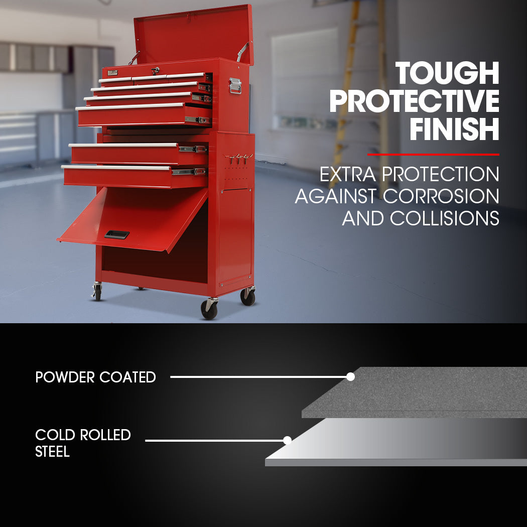 Both the cabinet and chest are built with high tensile powder coated steel enclosures. Equipped with an EVA mat, each drawer slides effortlessly in and out on smooth ball bearing rails, which makes finding and accessing each tool a cinch. The cabinet also comes with 3 pegs and the chest is easily transportable thanks to its side carry handles.