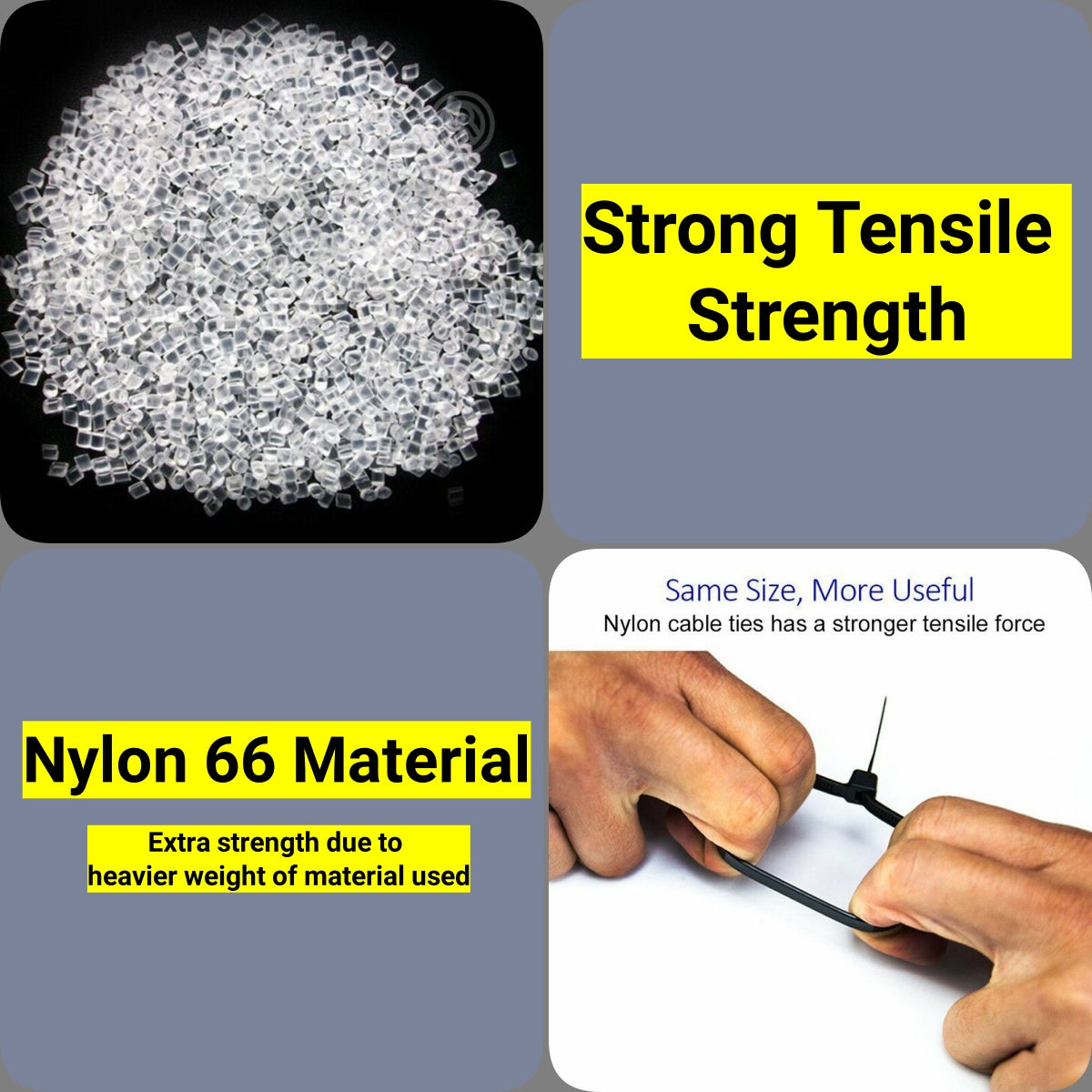 Our versatile cable zip ties are just right for you, giving you enough flexibility to hold any shapeof an object while maintaining strength.