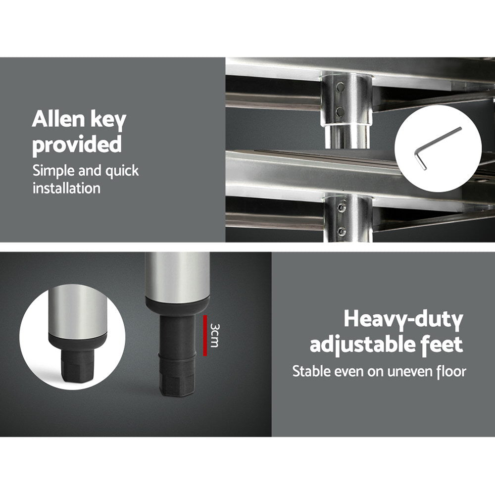 Our Stainless Steel Work Top is finished in commercial grade 430 stainless steel which makes it ideal for use in homes, cafes and restaurants. This bench, with much more space, is wider than the standard one in our stores.The treated bench edges provide extra safety working around the table while the adjustable bottom shelf allows you more height options for storage. Everything is held together firmly with the help of the included allen key for quick and easy installation. And if the floor is uneven, the adjustable legs can make things right with ease.