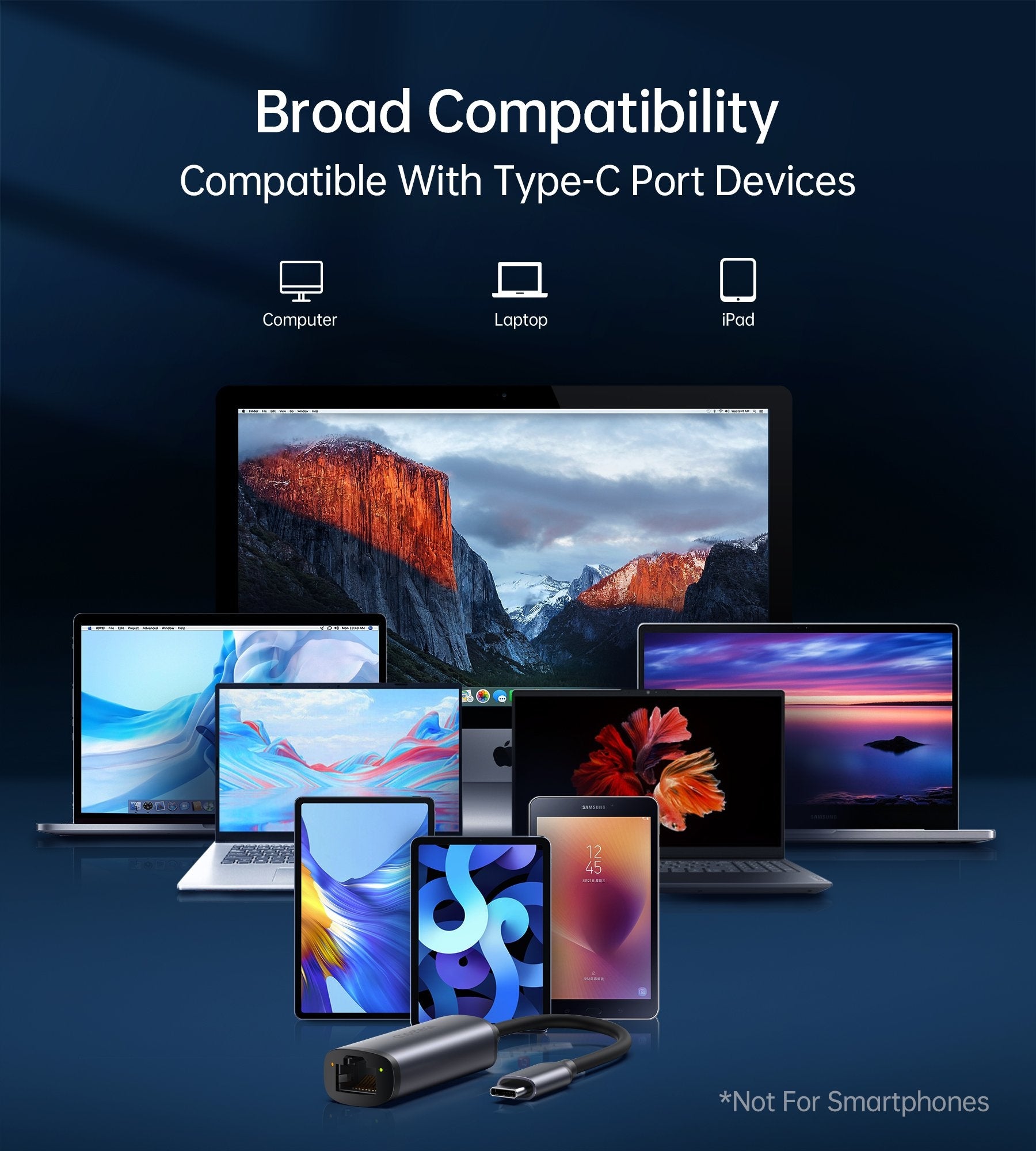 Plug-and-play design of the USB Type C to ethernet adapter simplifies connection and improves efficiency. High quality RJ45 network port maintain tight network cable connection.