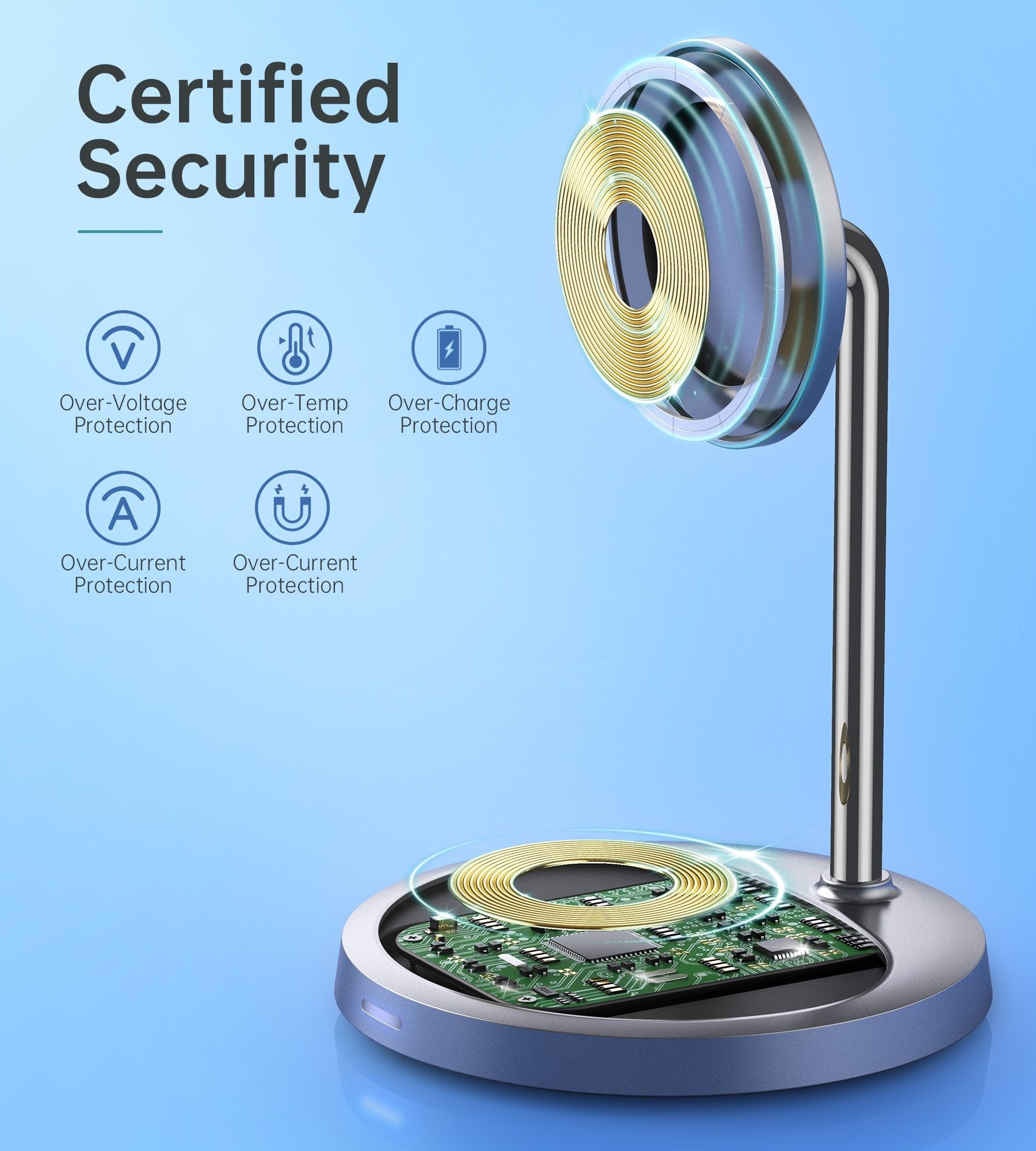 Unique LED lights indicate the charging status of your smartphone and earbuds at the same time. Qi & ETL Certified integrated smart chip keeps our wireless phone charger stand from over-charging, over-heating and short-circuit, providing a safe and secure charging environment.