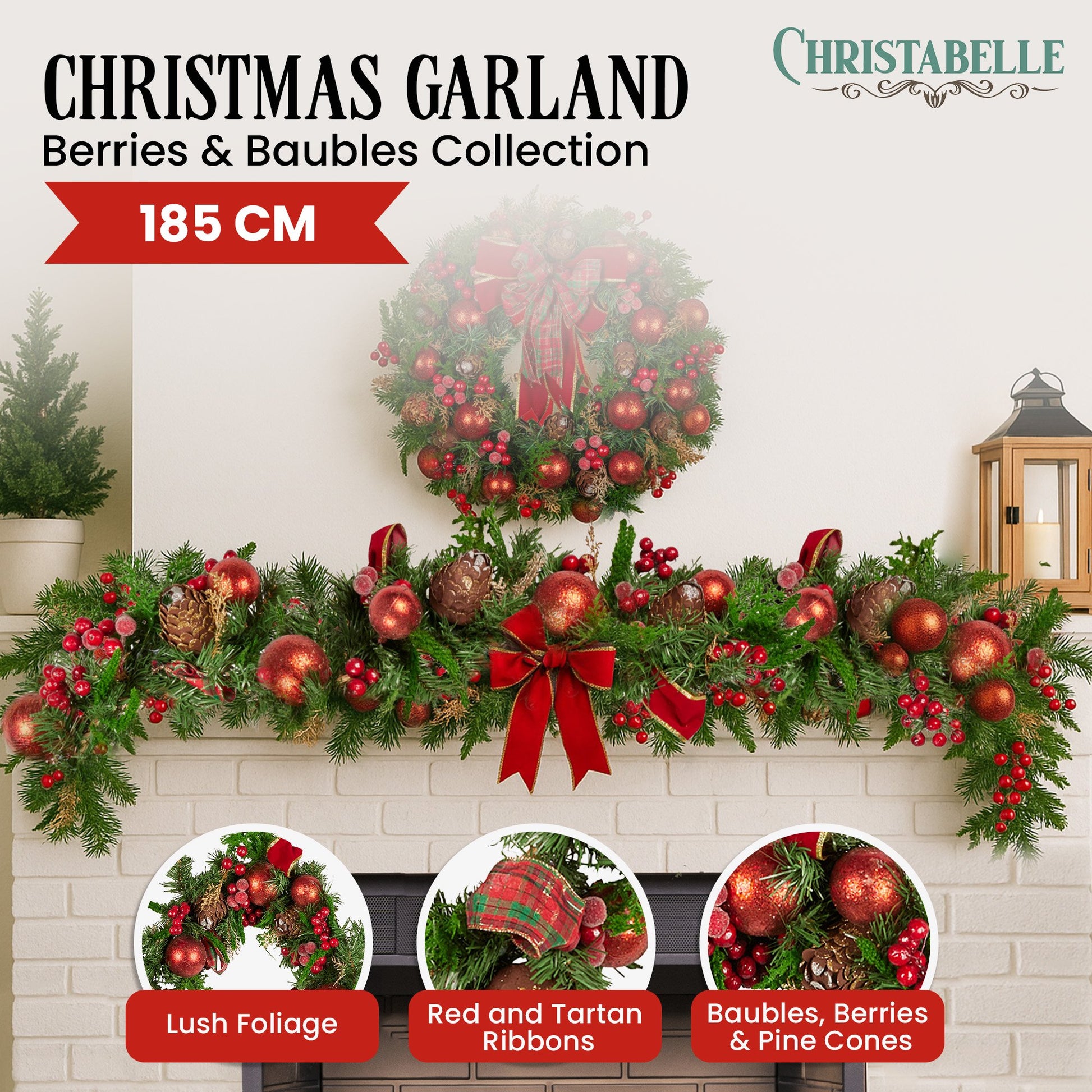 185cm Christmas Garland Lush Green Holiday Garland with Red Berries, Baubles & Pine Cones Pre-Decorated Festive Shelf or Banister Decoration