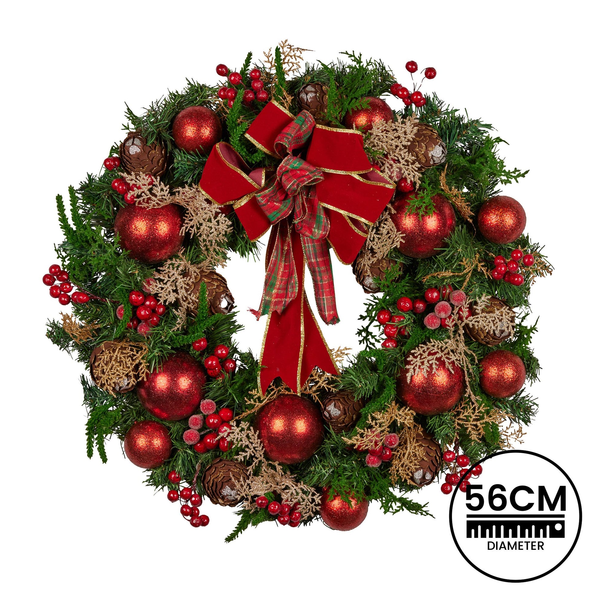 56cm Christmas Wreath Lush Green Holiday Door Wreath with Red Berries, Baubles & Pine Cones Pre-Decorated Festive Wall or Front Door Decoration