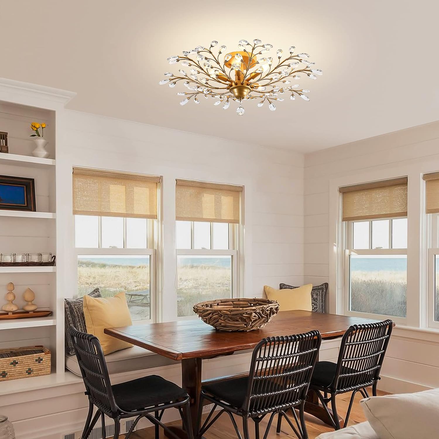 - ELEGANT ATMOSPHERE:This gold ceiling light is adorned with transparent glass crystals that capture and reflect the light of the bulb, creating a warm and inviting atmosphere. Its classic design is sure to add a touch of sophistication to any room.