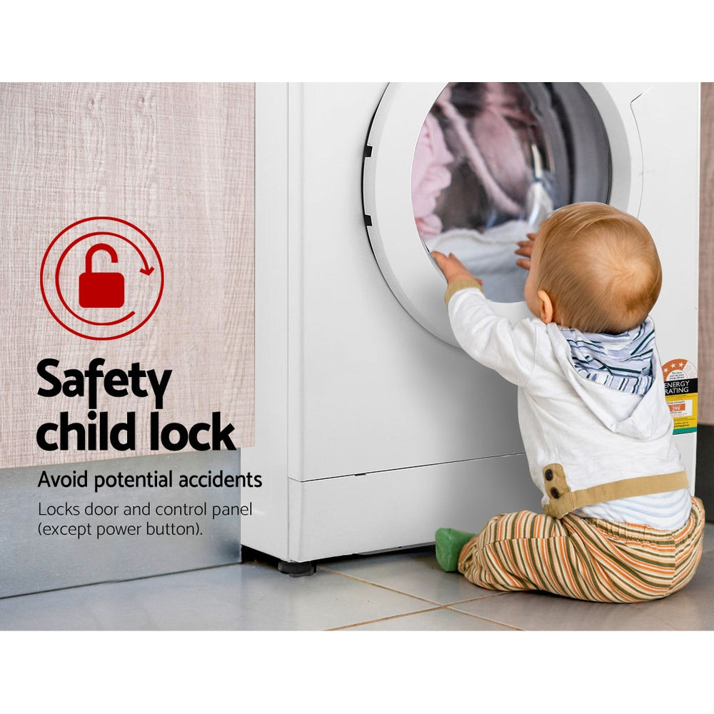 With up to 8kg of washing capacity, our Devanti Front Load Washing Machine certainly makes light work of your washing. Choose from 15 programs to suit your requirements, including useful 18-minute quick wash and anti-allergy modes. To save on energy bills, you can also delay start up to 24 hours to do your washing during off-peak hours. Other great features include hot water washing of up to 90鎺矯 water temperature, LED display screen and a very efficient and effective spin speed of 1400rpm. The large opening facilitates easy loading and unloading, and a child-lock feature also ensures that the front door and control panel will be locked from accidental tampering by any child. Not least, the washing machine has energy and water ratings of 4 stars and is SAA-approved for Australian usage.