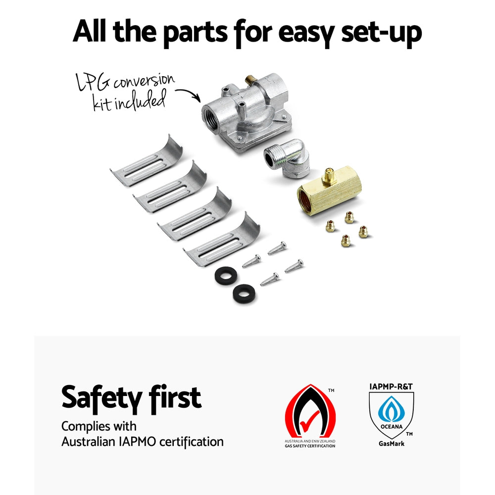 Whether it is for your existing or new home, our Devanti 60cm Gas Cooktop is just the right thing you need for easy, no-fuss cooking. Loaded with an extensive list of chef-friendly features such as an easy ignition system, easy-to-use powder-coated knob controls with safety lock and a flame failure safety device, the cooktop is also incredibly sleek with its stainless steel surface. It features four burners including two semi-rapid burners, one wok burner and one auxiliary burner, all with various power levels to choose from to prepare that perfect dish. The solid cast iron grates hold up your pots and pans perfectly steady and are longlasting and heat-resistant as well. And a pan support is included for use with the auxiliary burner to prevent tiny pans from tipping over and messing up your cooktop. The cooktop is factory set for natural gas but is compatible with LPG once the included LPG conversion kit is installed. Powerful and yet integrally safe, the cooktop promises many moments of hassle-free delicious cooking with the right blend of sophistication and class for your kitchen.