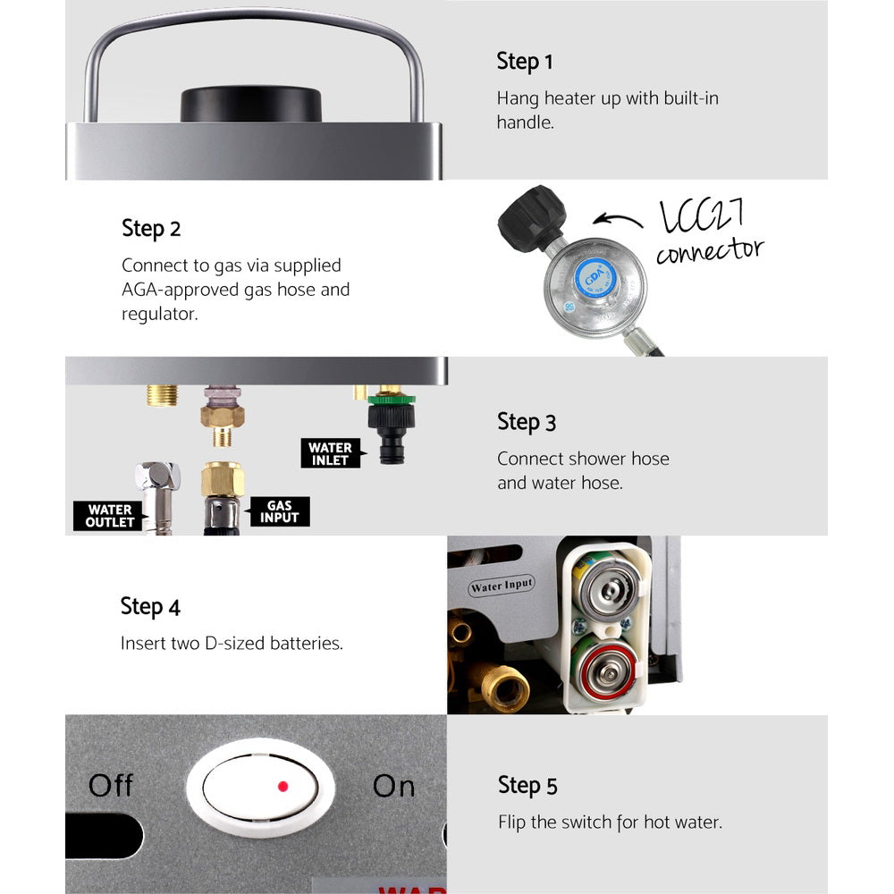 Devanti Portable Gas Water Heater 8L/Min LPG System Grey
