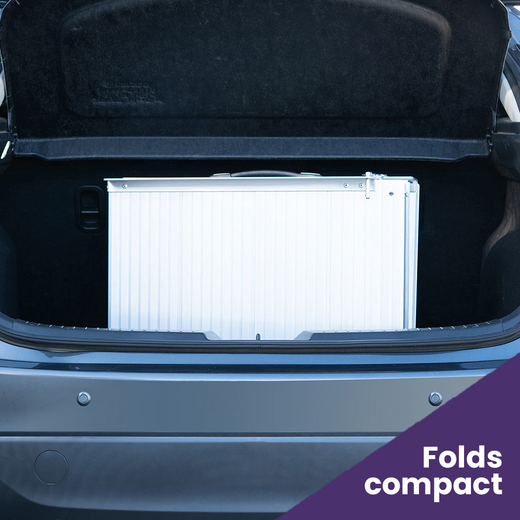 Equipmed ramps are expertly machine welded with non-slip serrated slats and side rails for peace of mind. The ramp comes complete with 2 x locking pins that keep it folded when carrying.
