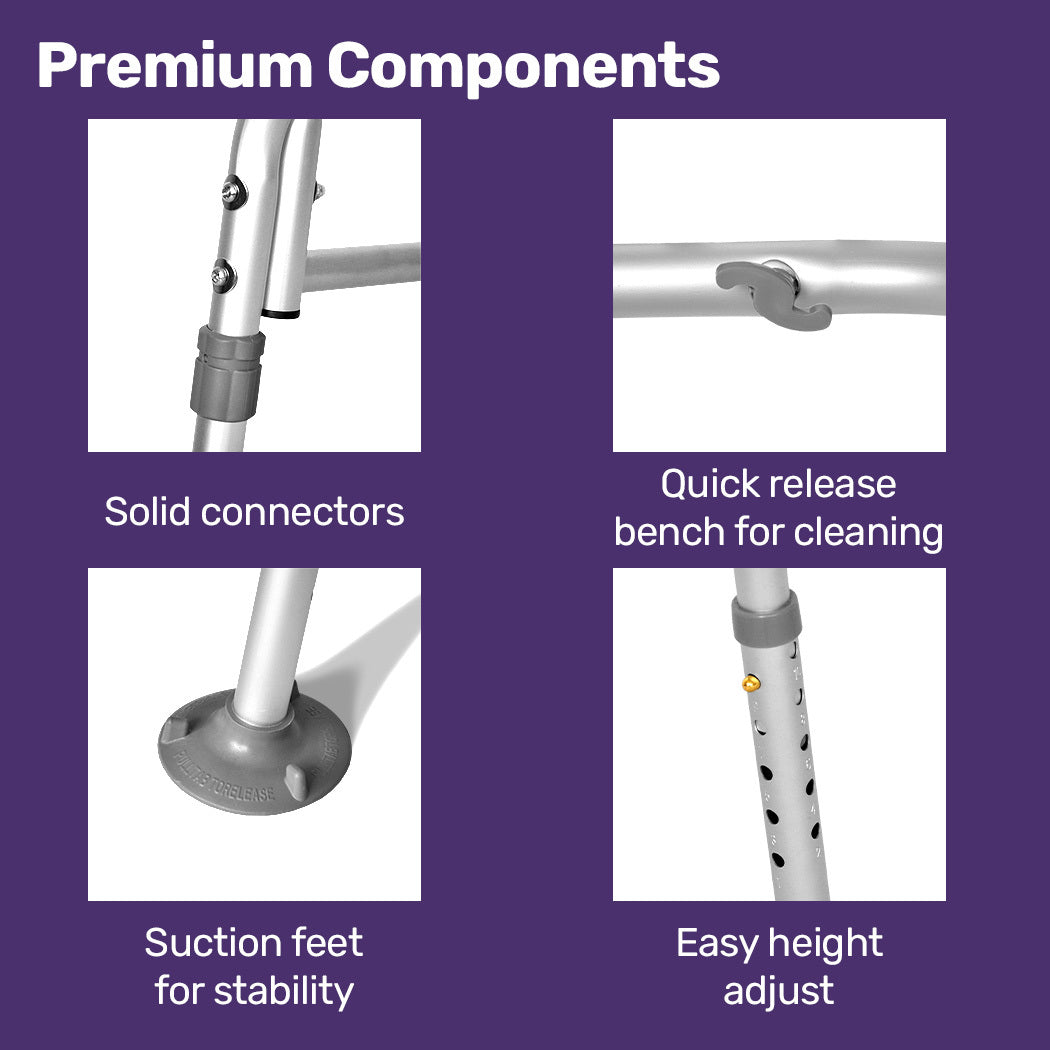 Introducing the Equipmed Bath Transfer Bench - your ultimate bathroom seating assistance. Whether you require assistance getting into and out of the bath or shower, transferring from an Equipmed mobility aid, or caring for a loved one this lightweight, ergonomic, and user-friendly design ensures you or your loved one get the support they need.
