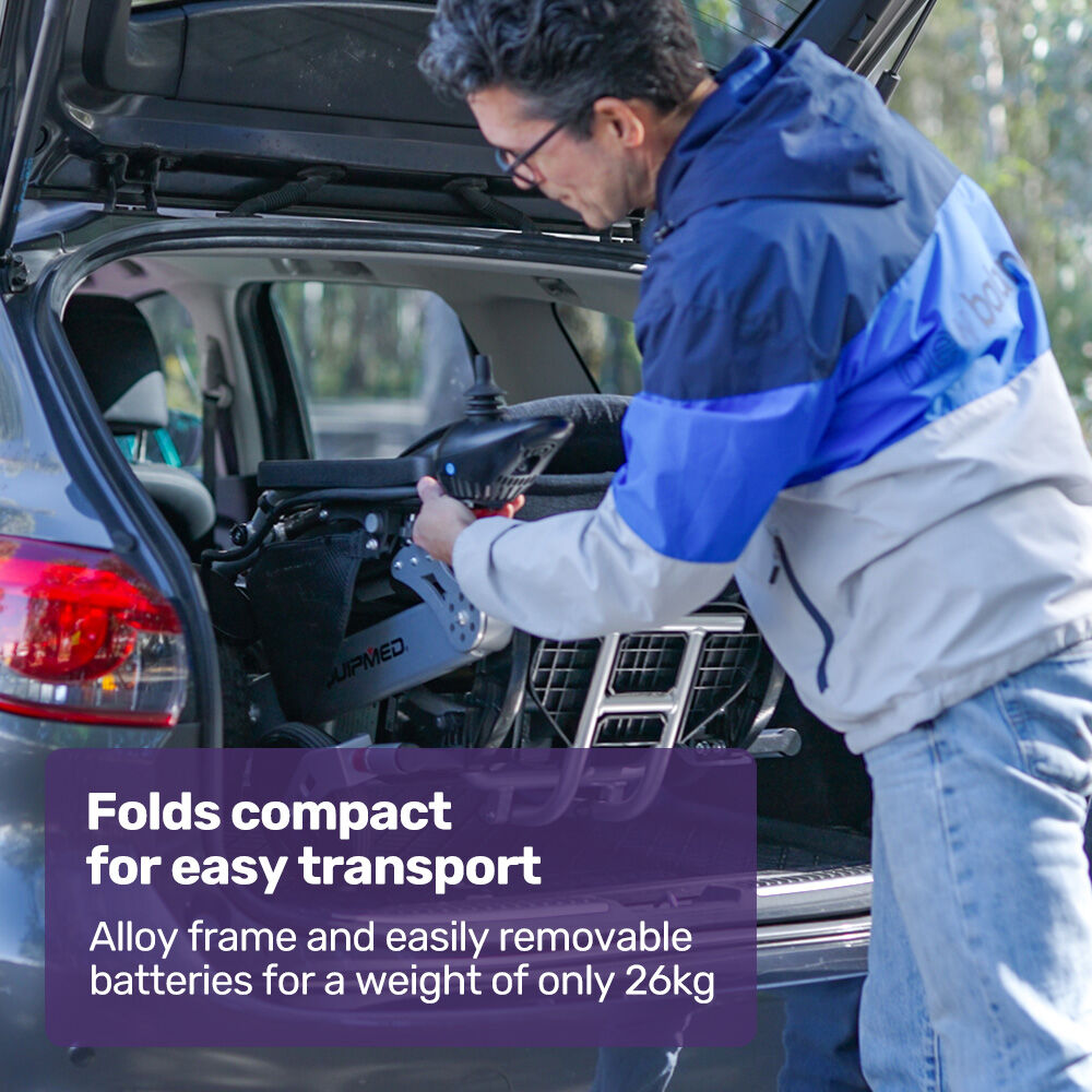 The Equipmed motorised wheelchair is quick to fold. Plus, an alloy frame and easy-to-remove batteries mean that it is as light as possible for loading into a car boot or moving into a space-saving storage position.