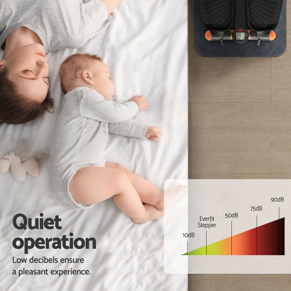 Step up your fitness game with a Mini Stepper from Everfit. Target your thighs, calves, waist and hips without leaving your home. The Mini Stepper is portable thanks to its miniature size, making it perfect for use under your desk, in the living room, or on the go. The stepper has an anti-slip pedal surface and edge for safety and stability, and your package includes a non-slip rubber mat to keep everything in its place. The stepper has a high weight capacity of 150kg and the upgraded mute ring design operates quietly for a pleasant exercise session that wont disturb your guests or family. The LCD screen will show you all your fitness data as you exercise, and the detachable soft pedal pad is easy on your feet and easy to maintain. It requires no assembly and folds neatly away when not in use. Best of all, the stepper comes with two bonus resistance ropes so you can perform a variety of exercises. Get fit today from the comfort of your home or office with the versatile Everfit Mini Stepper.