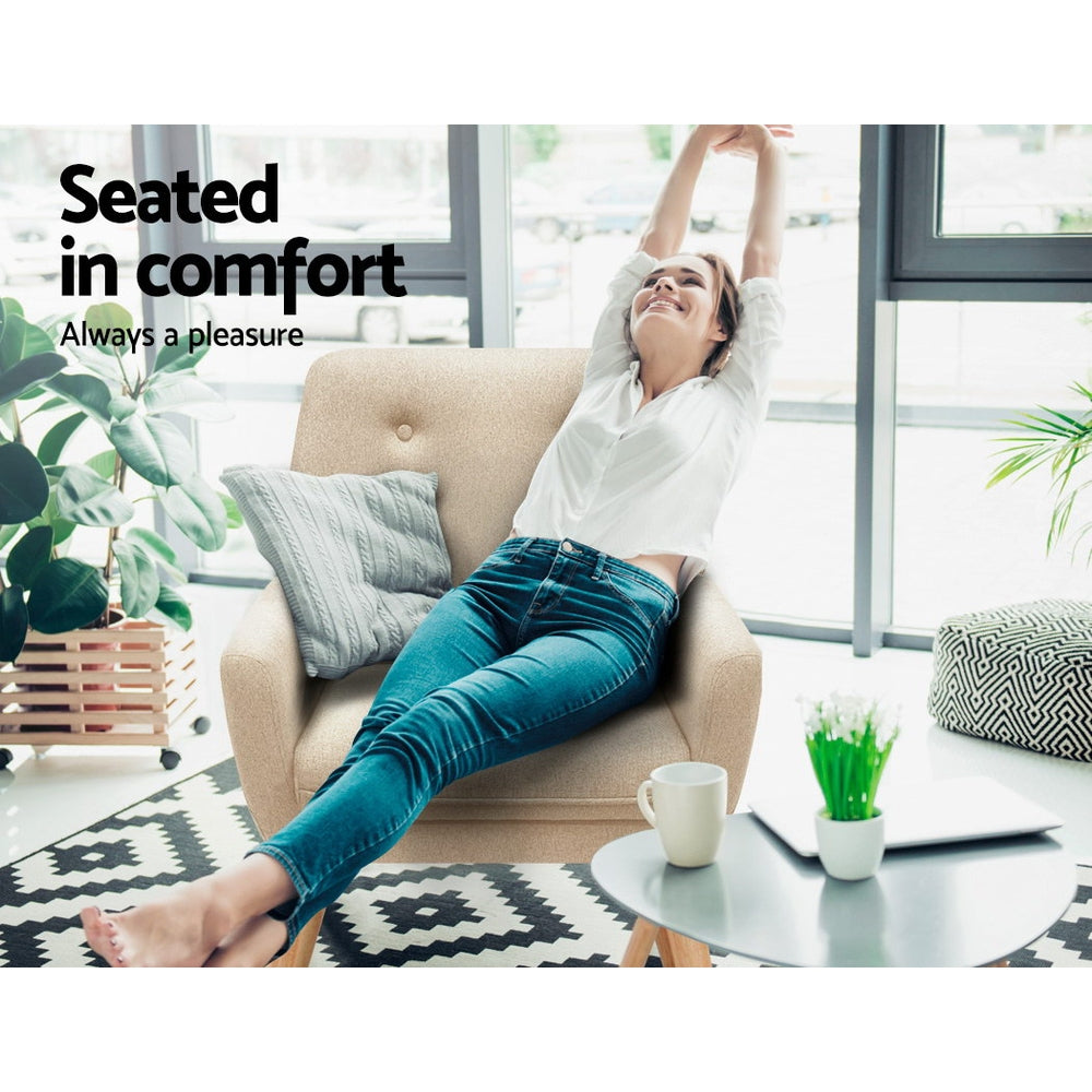 Upholstered in quality linen fabric, the Anne Armchair is a full size chair with generous seating space. The extra thick foam padding ensures ultimate comfort with exceptional support while the tufted backrest adds an array of luxurious highlights to the overall character of the armchair. Together with a reinforced wooden frame and sturdy tapered rubber wood legs, the Anne Armchair is guaranteed to stand up to durable use for many years to come. Not least, with its neutral tones, the Anne Armchair is a seamless match for any home décor.