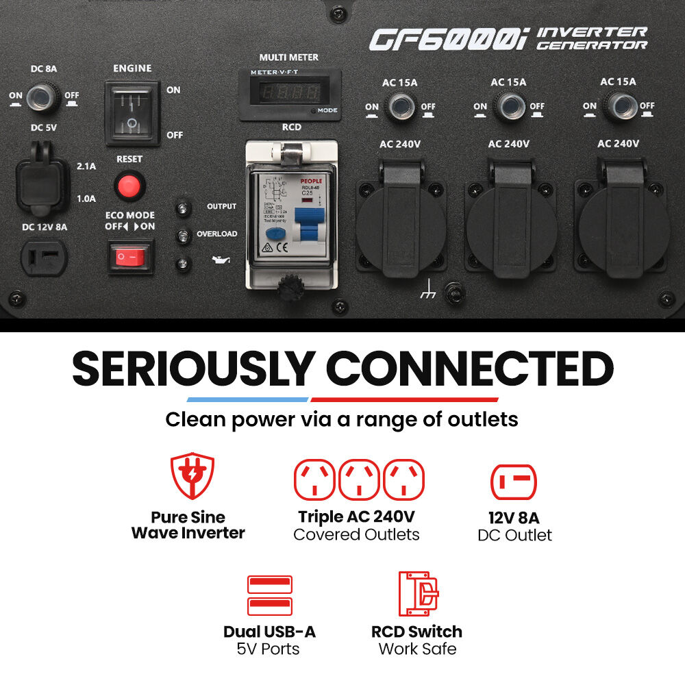 Flexibility is built into its design. You閳ユ獟l find three 15A Australian sockets, a 12V DC outlet, and dual USB ports, giving you the ability to charge and power everything from tools to tech. Safety is a priority with overload, low-oil, and over-temperature protections, plus an RCD safety switch for added peace of mind. The brushless copper alternator ensures durability, while forced air cooling keeps everything running smoothly.