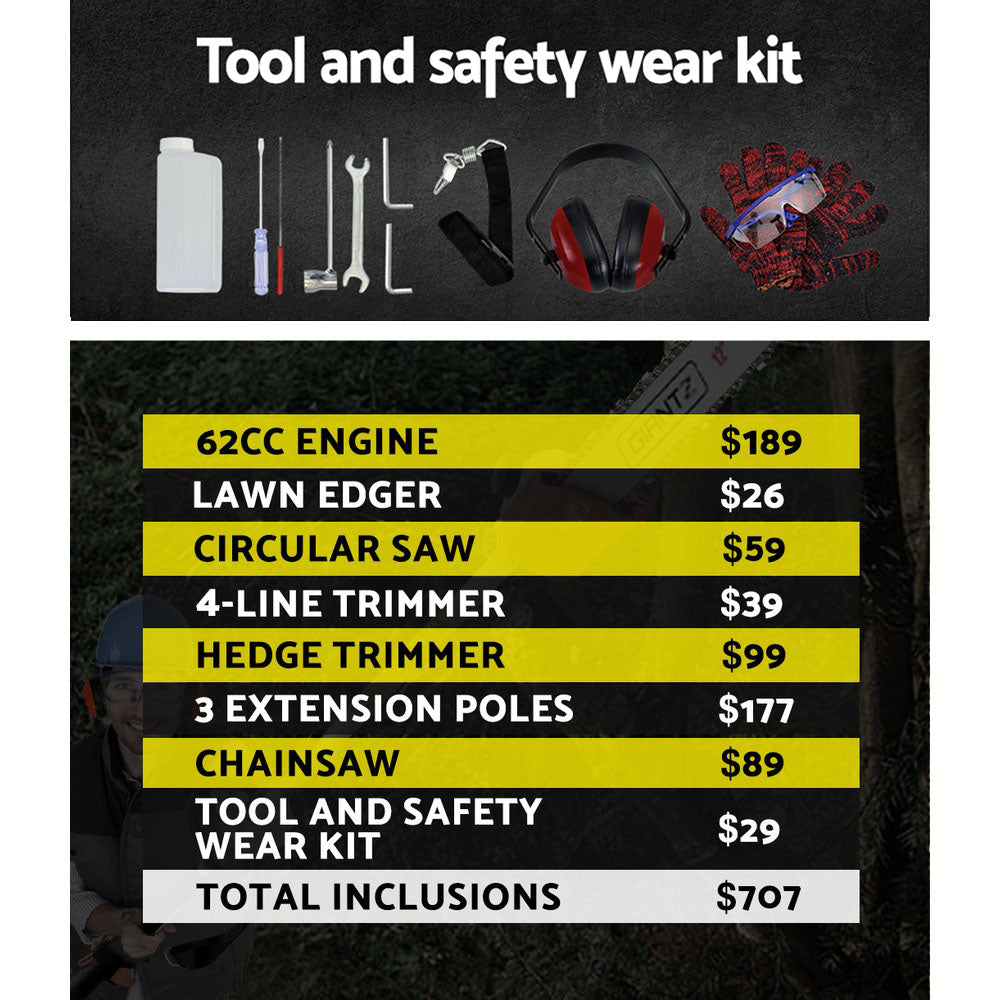 62CC Pole Chainsaw Hedge Trimmer Brush Cutter Whipper Saw Snipper 7-in-1