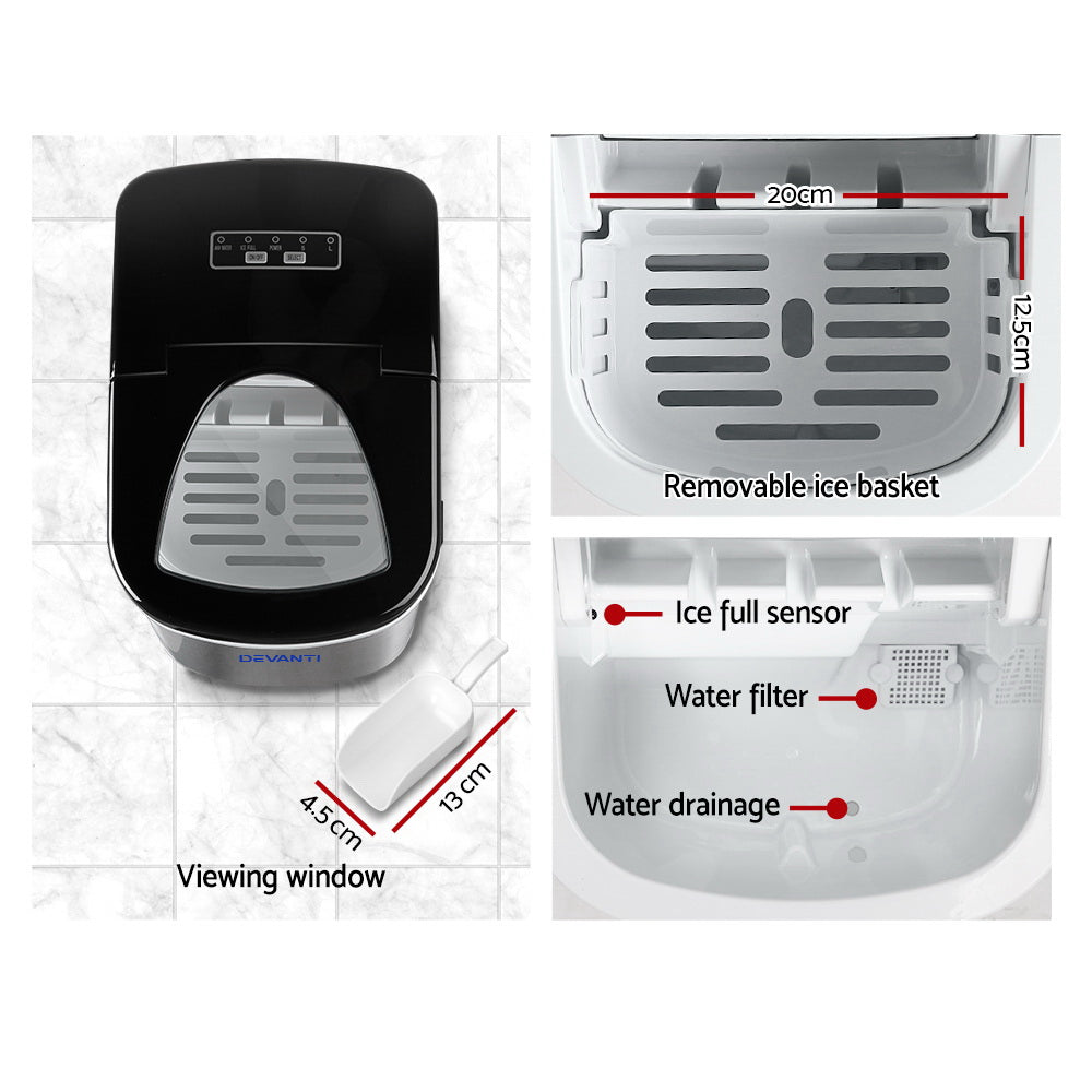 Looking for ice in a hurry? Meet our Devanti Ice Maker! Quickly produce 9 ice cubes in 6-11 minutes, with the flexibility to choose from 2 sizes. It's loaded with smart features like water shortage and ice full alarms, plus energy-saving technology through Freon-free refrigerant and enhanced heat dissipation. Its sleek, compact design fits anywhere, and with its easy-to-use controls, youll be enjoying cold beverages in no time. Ice at home has never been cooler!