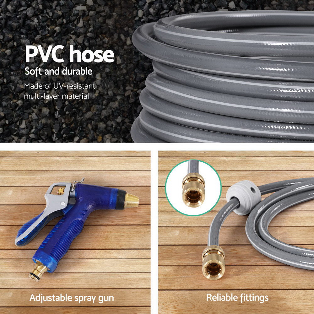 With a 180鎺 swivel wall mount, PVC hose, and a built-in handle for portability, this reel is both practical and versatile. The adjustable multimode spray gun and durable fittings make watering tasks effortless, whether you're tending to plants or cleaning surfaces. Compact and user-friendly, it's a must-have for maintaining an organised and efficient outdoor space.